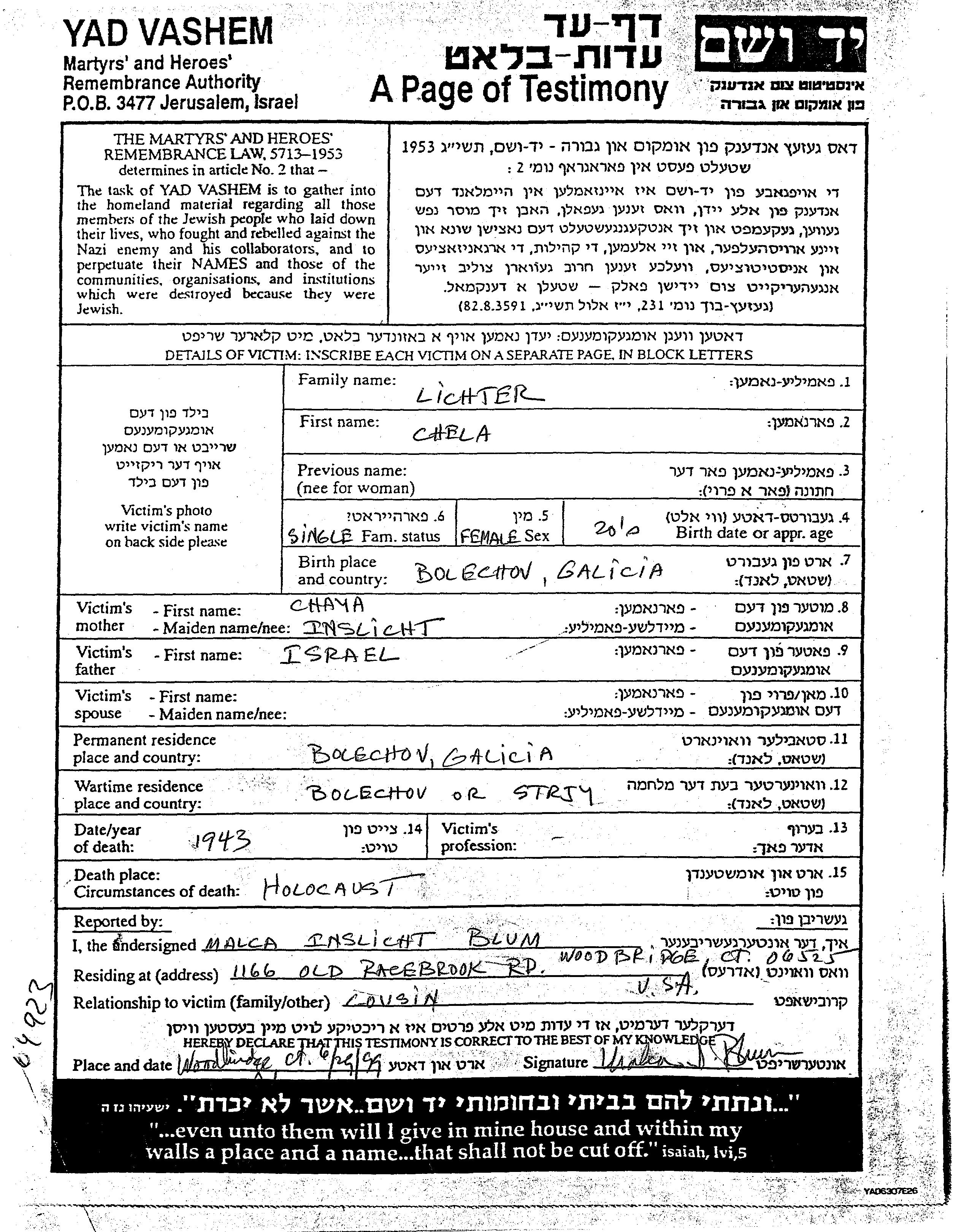 Хела Лихтер, место рождения: Болехов, Польша. Отец: Исраэль, mать:Хая. Холост / не замужем. Место жительства до войны: Болехов, Польша. Место во время войны: Стрый, Польша.