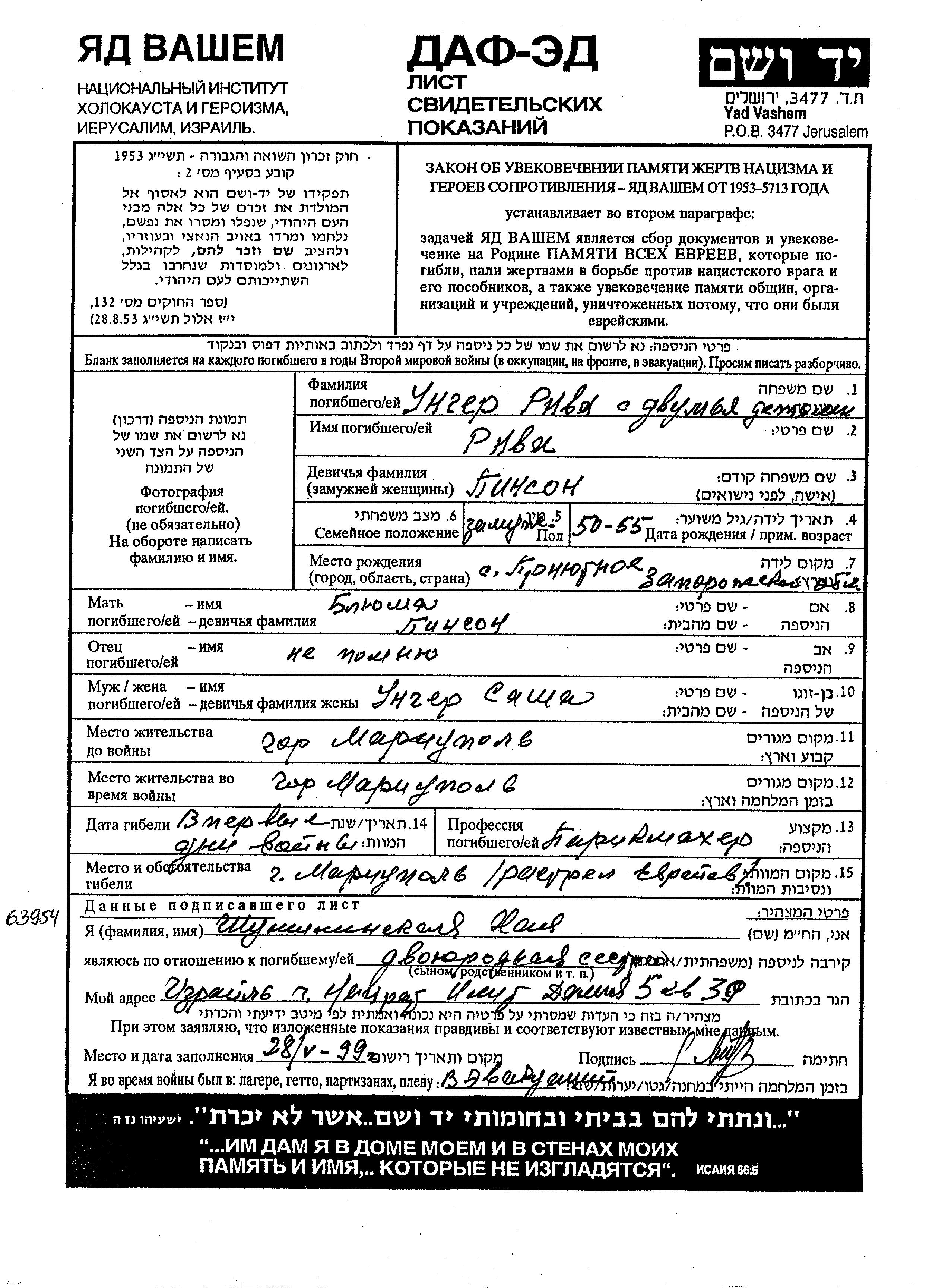 Унгер Рива Мариуполь, Украина (СССР) Лист свидетельских показаний