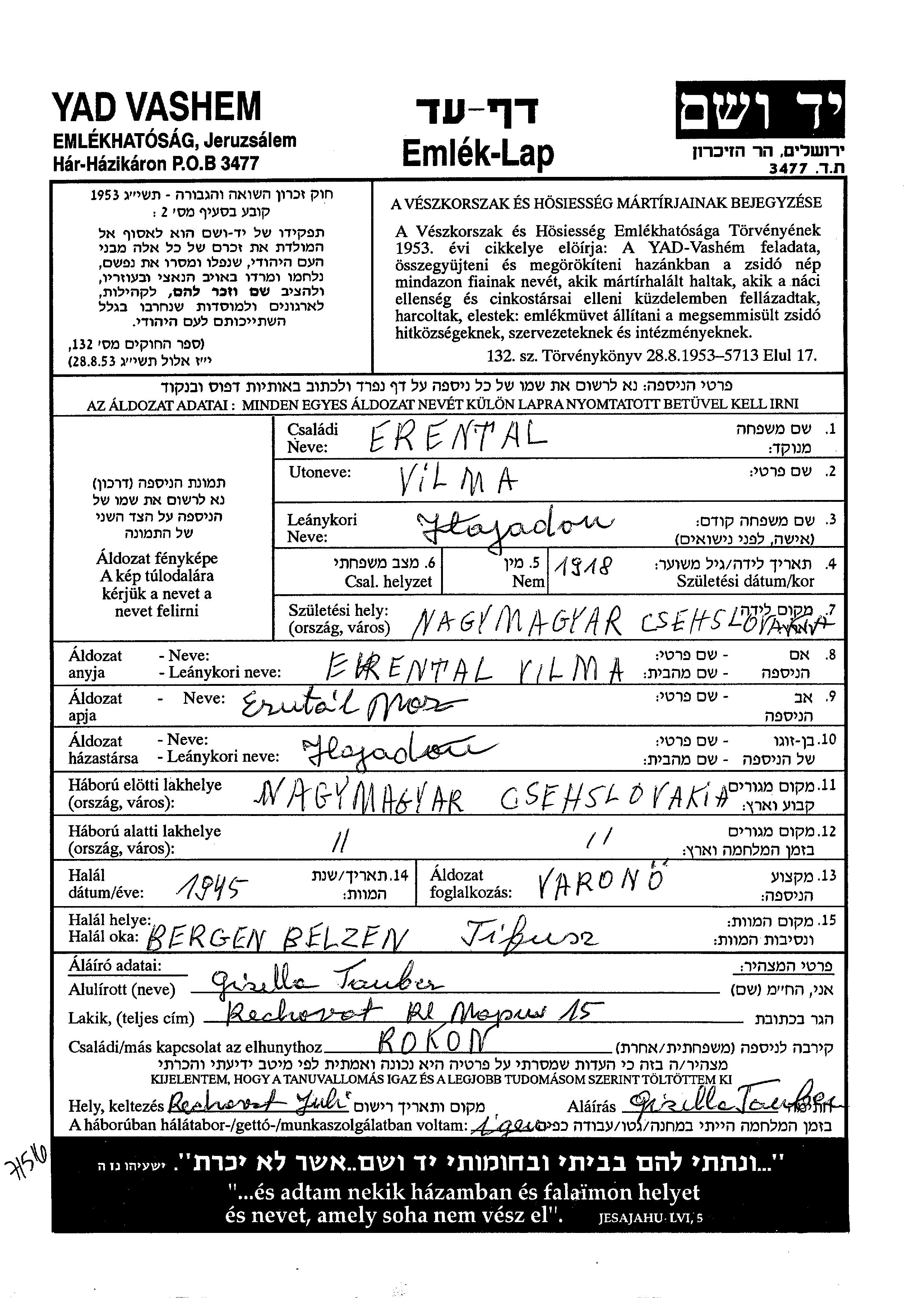 Вилма Эренталь, место рождения: Надьмадьяр, Чехословакия. Отец: Мор, mать:Вилма. Швея. Холост / не замужем. Место жительства до войны: Надьмадьяр, Чехословакия. Место во время войны: Надьмадьяр, Чехословакия.