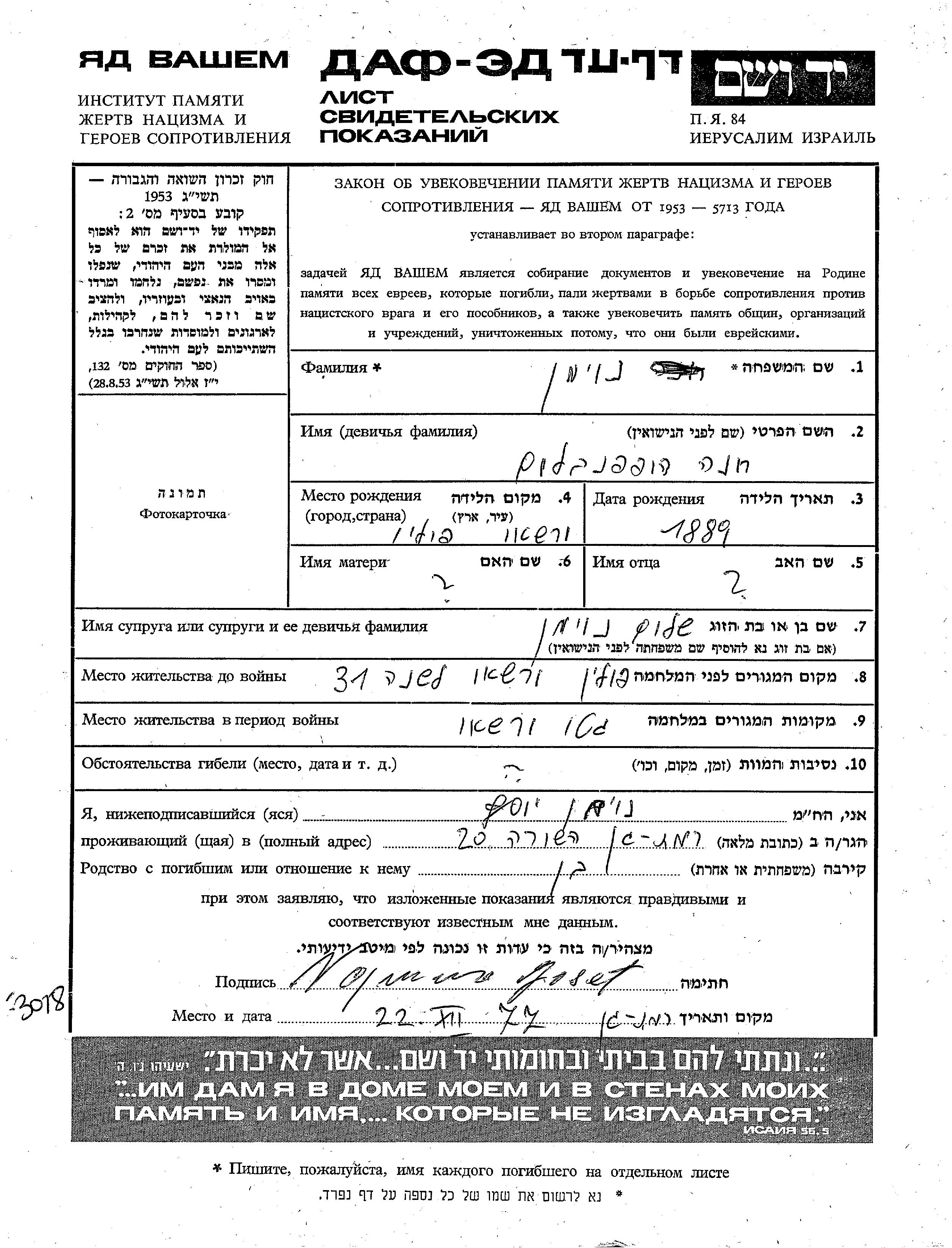 Яд Вашем - Листы свидетельских показаний Мемориального фонда