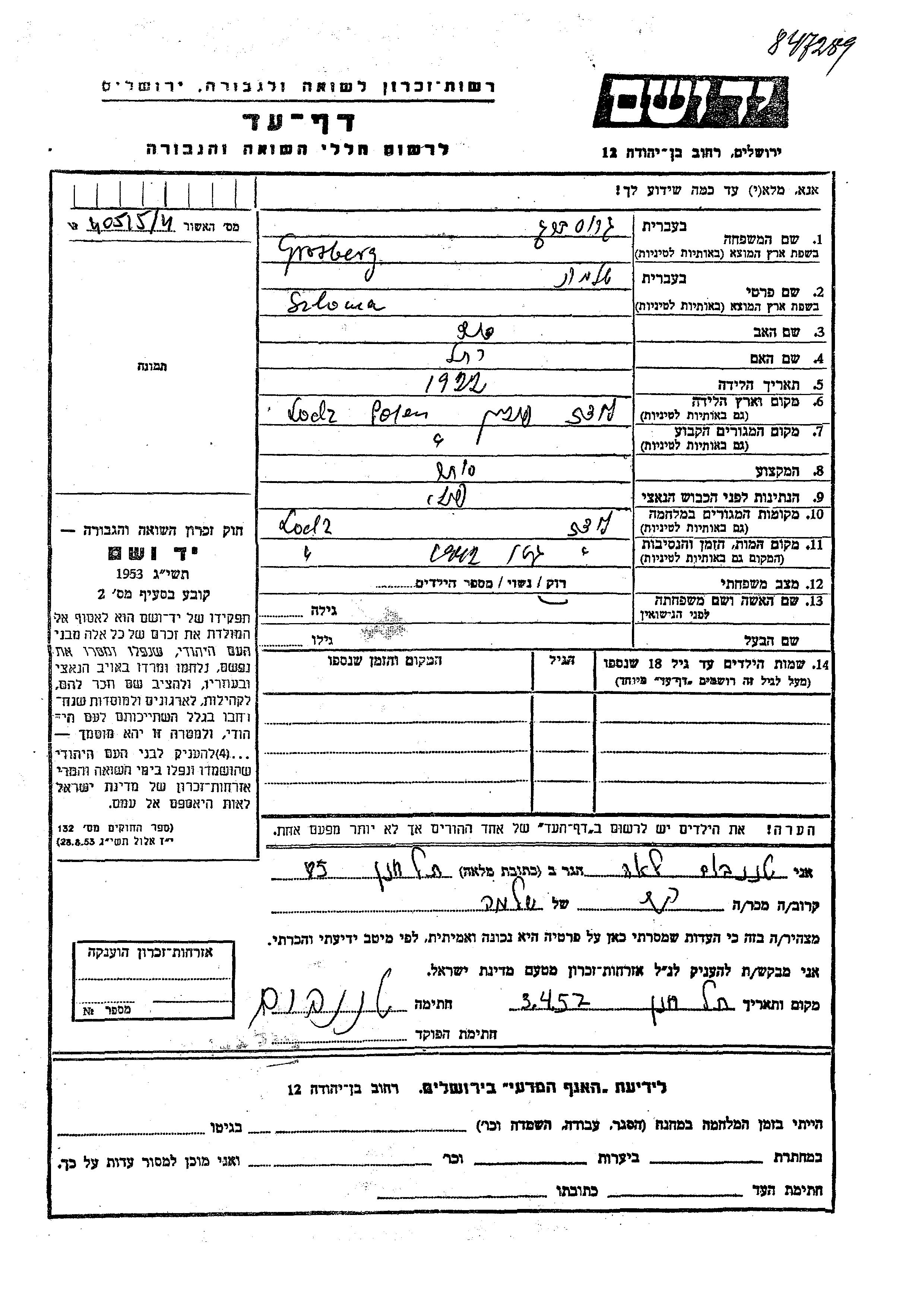 Гросберг Шлома 1922 Лодзь, Польша Лист свидетельских показаний