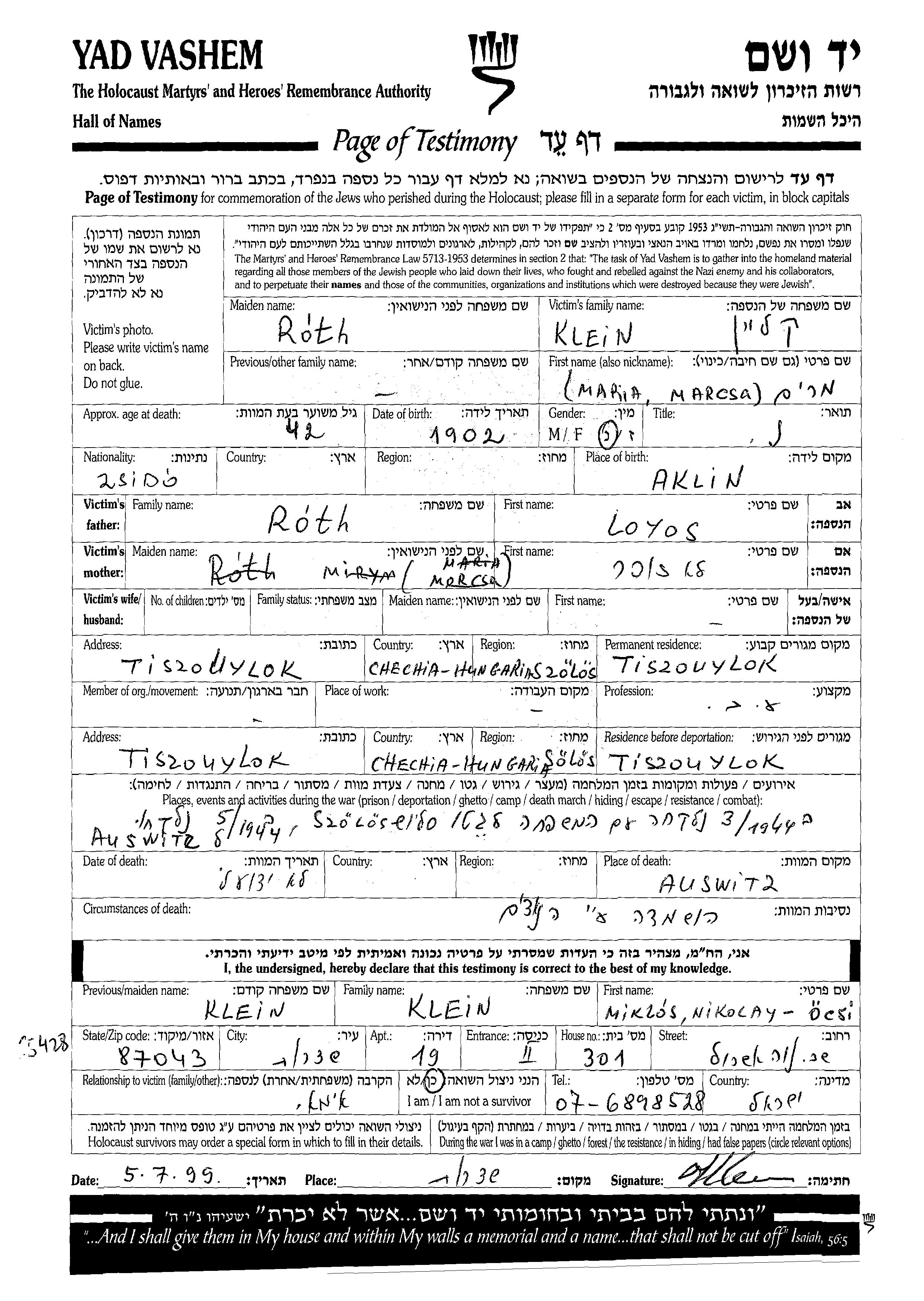 Мария Марча Мирьям Клейн, девичья фамилия Рот, место рождения: Аклин, Чехословакия. Отец: Лойош. Домохозяйка. Место жительства до войны: Сёлёш, Чехословакия. Место во время войны: Сёлёш, Чехословакия.