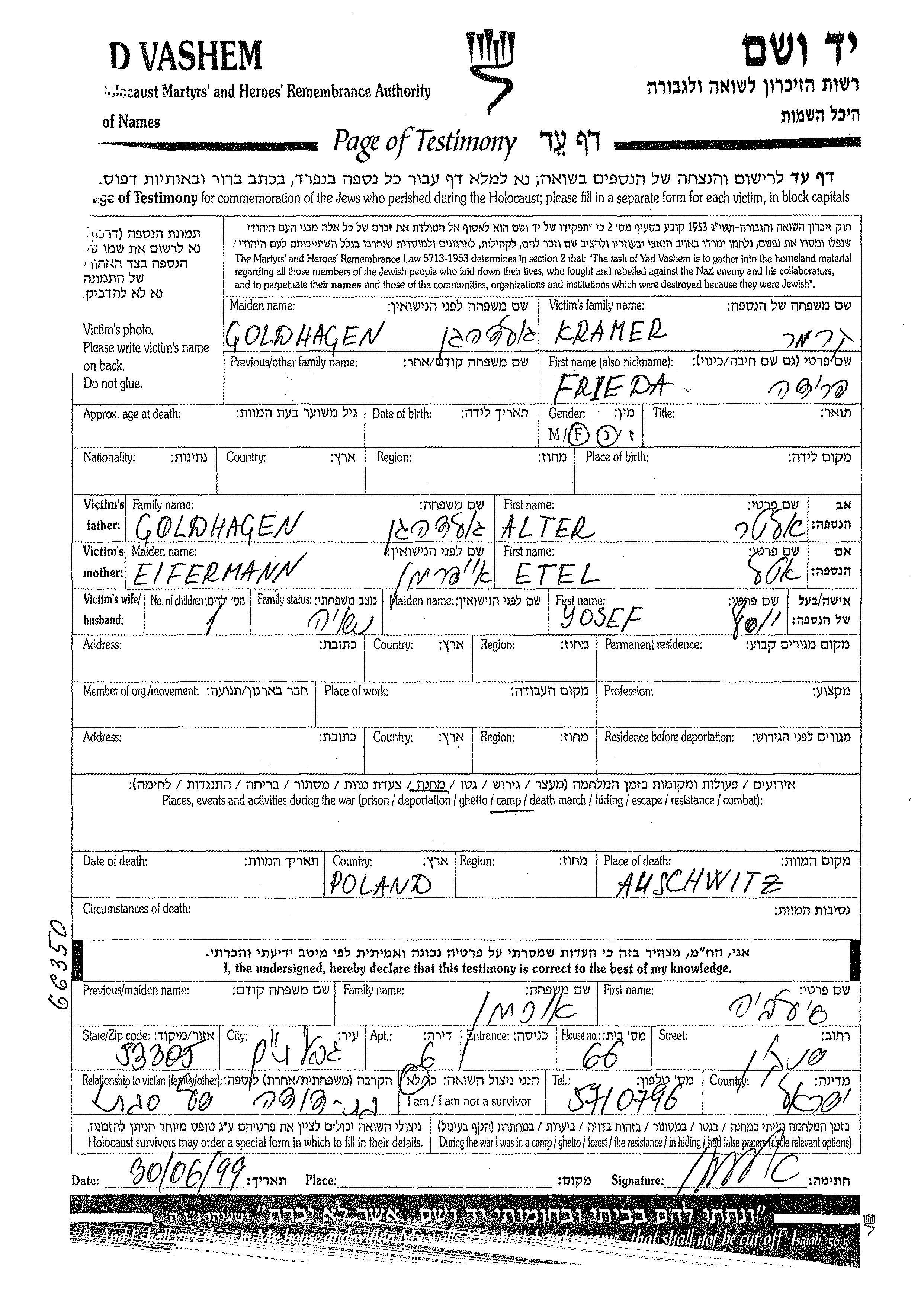 Крамер Фрида место не указано, Лист свидетельских показаний