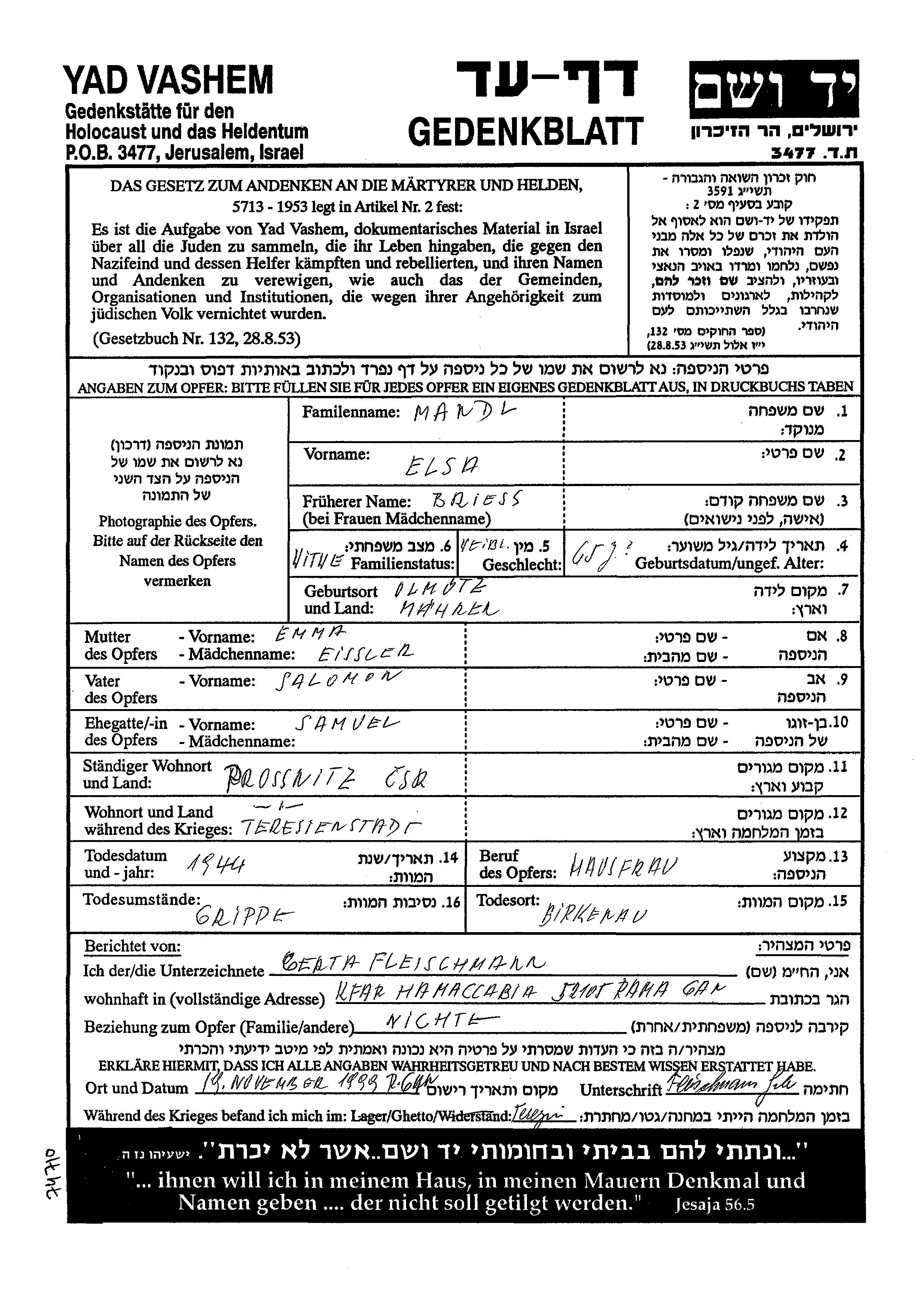 Эльза Мандль, девичья фамилия Брисс, место рождения: Ольмюц, Чехословакия. Отец: Саломон, mать:Эмма. Домохозяйка. Вдова. Место жительства до войны: Просснице, Чехословакия. Место во время войны: Терезиенштадт, Чехословакия.
