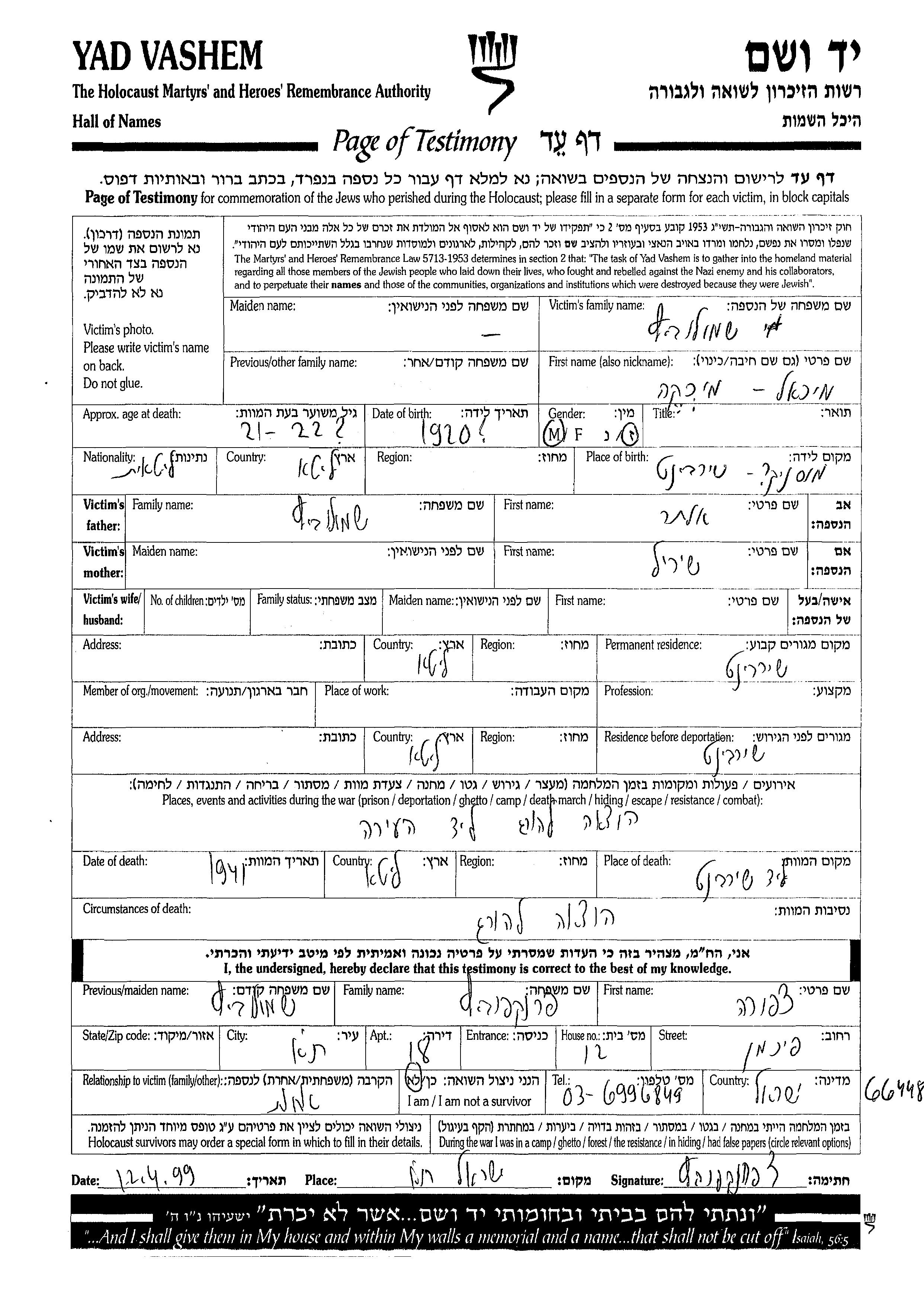 Яд Вашем - Листы свидетельских показаний Мемориального фонда