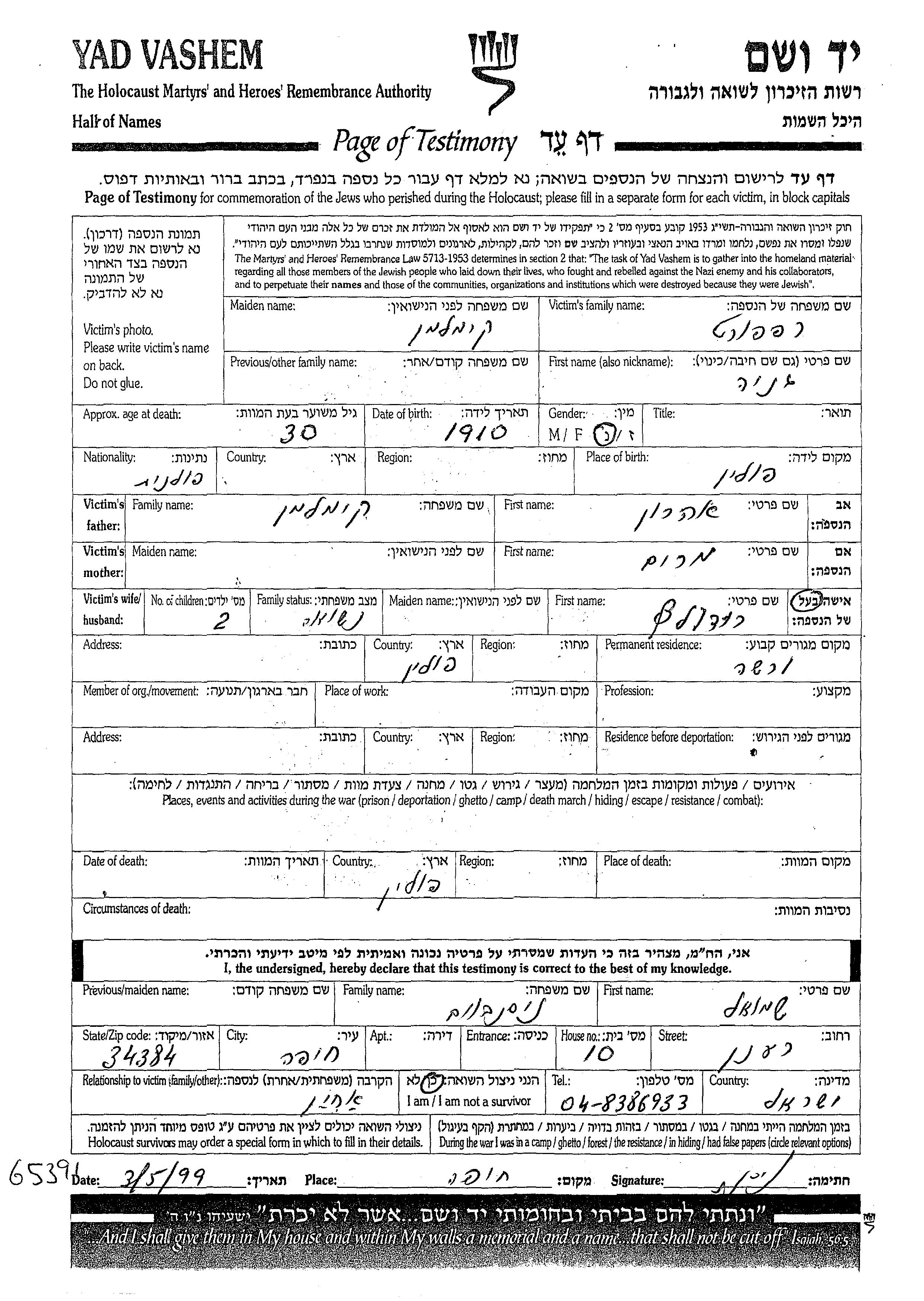 Геня уничтоженa в период Шоа. место смерти: Польша.