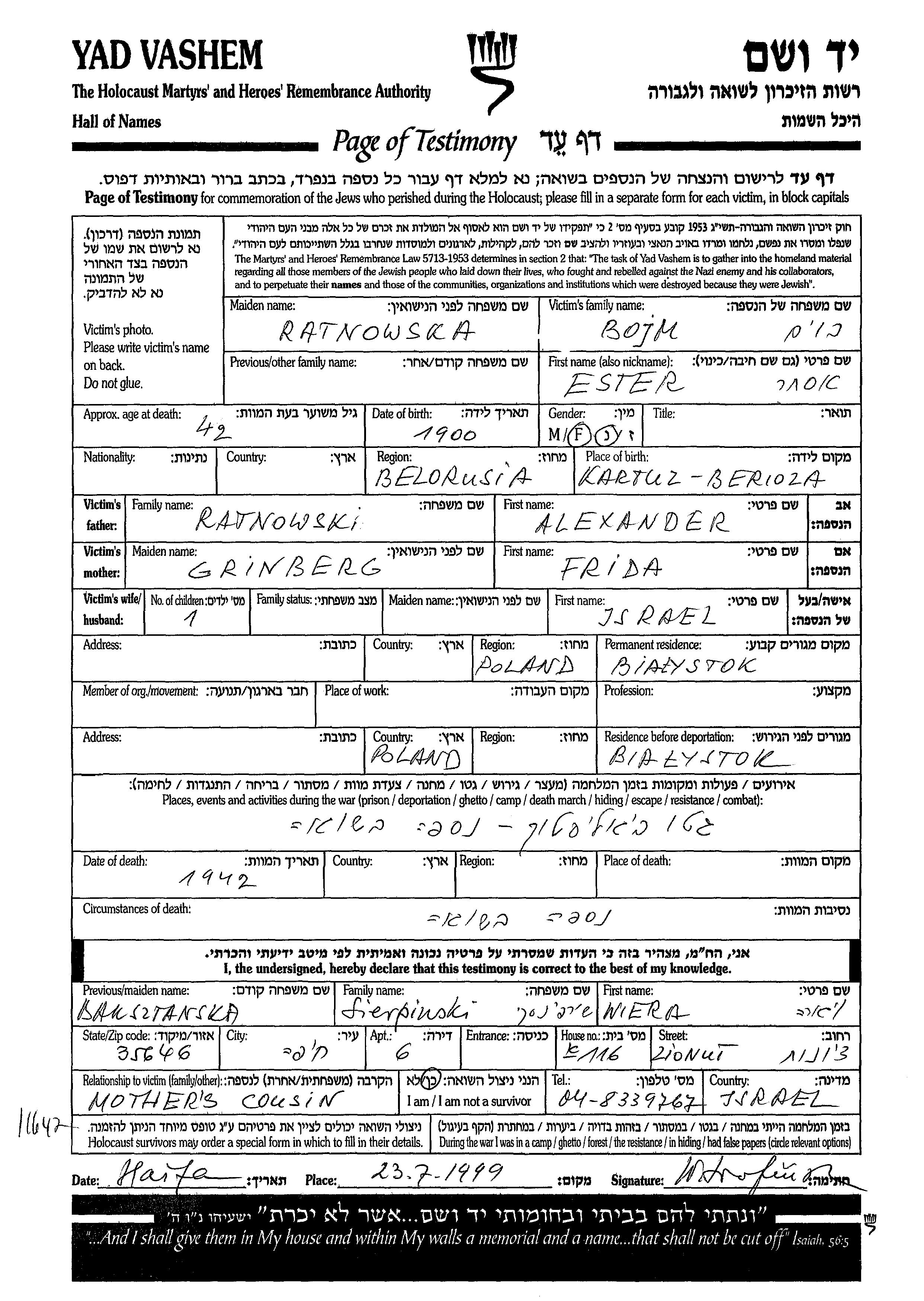 Эстер Бойм, девичья фамилия Ратновска, место рождения: Картуз-Береза, Польша. Отец: Александер, mать:Фрида. Женат / замужем. Место жительства до войны: Белосток, Польша. Место во время войны: Белосток, Польша.