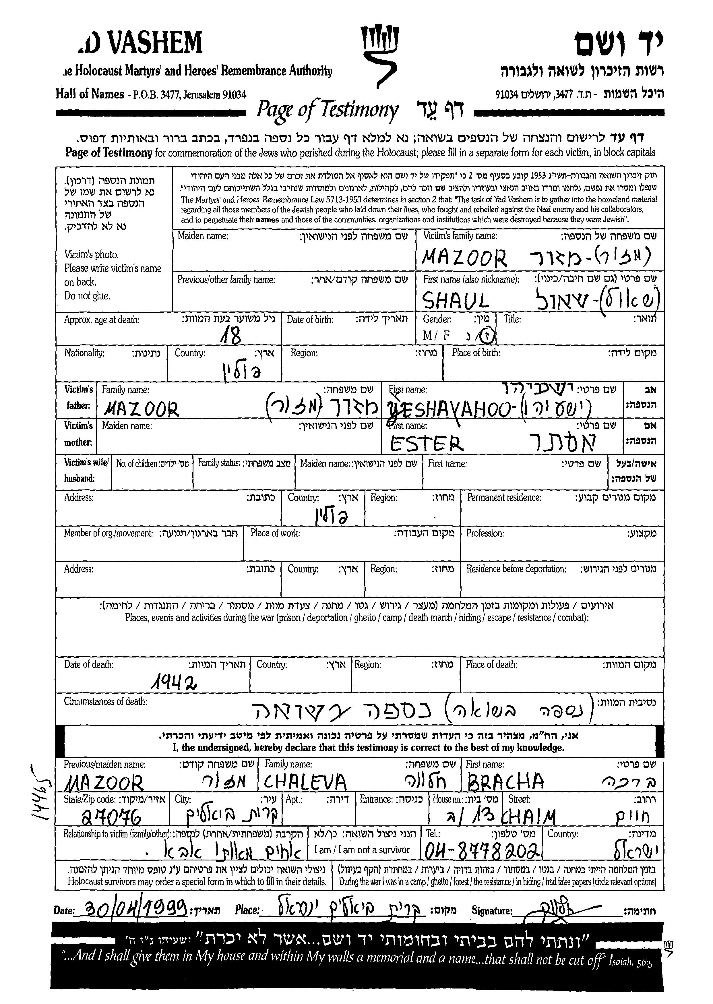 Шауль Мазор, место рождения: Польша. Отец: Ешаяху, mать:Эстер. Место жительства до войны: Польша.
