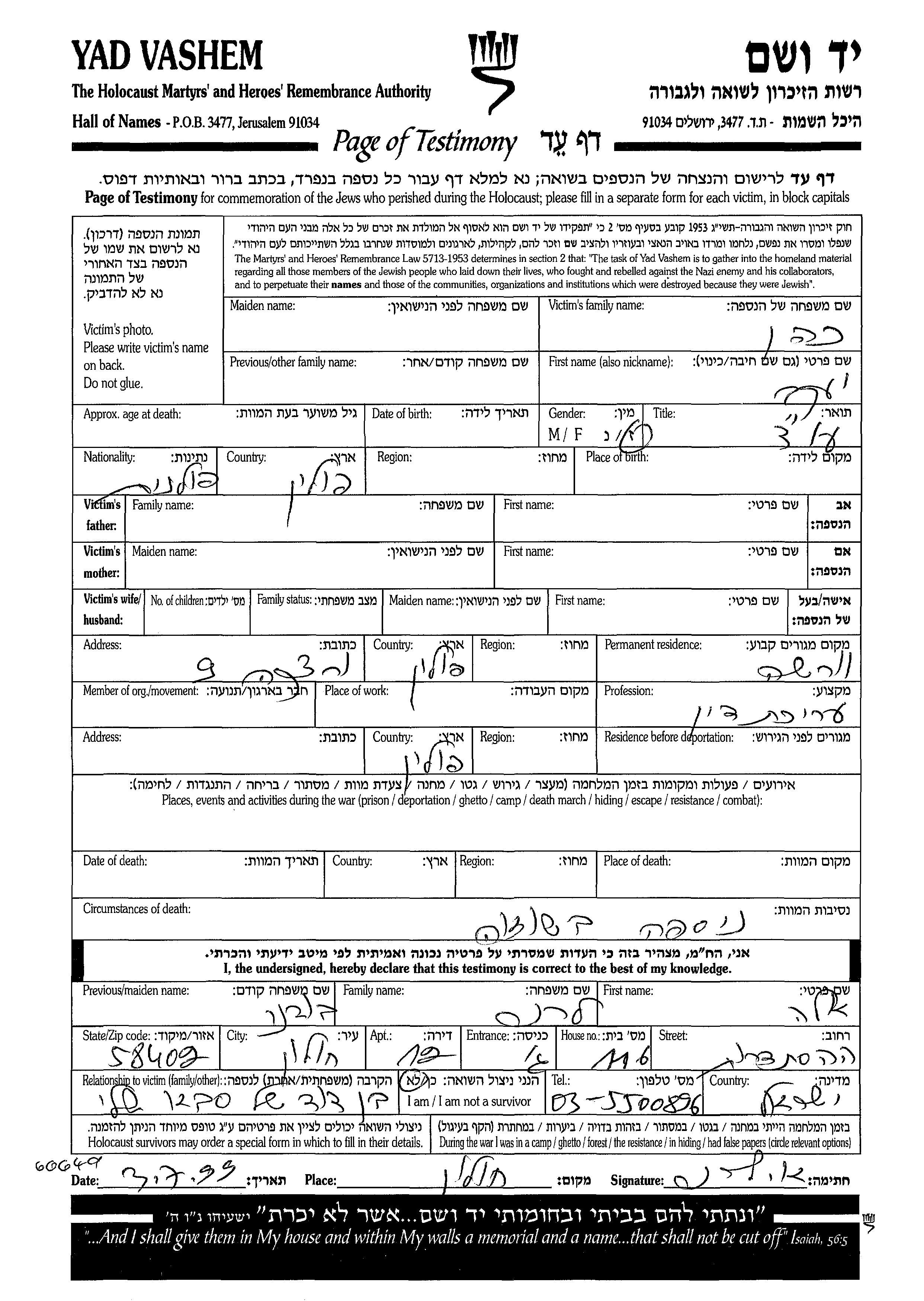 Яд Вашем - Листы свидетельских показаний Мемориального фонда