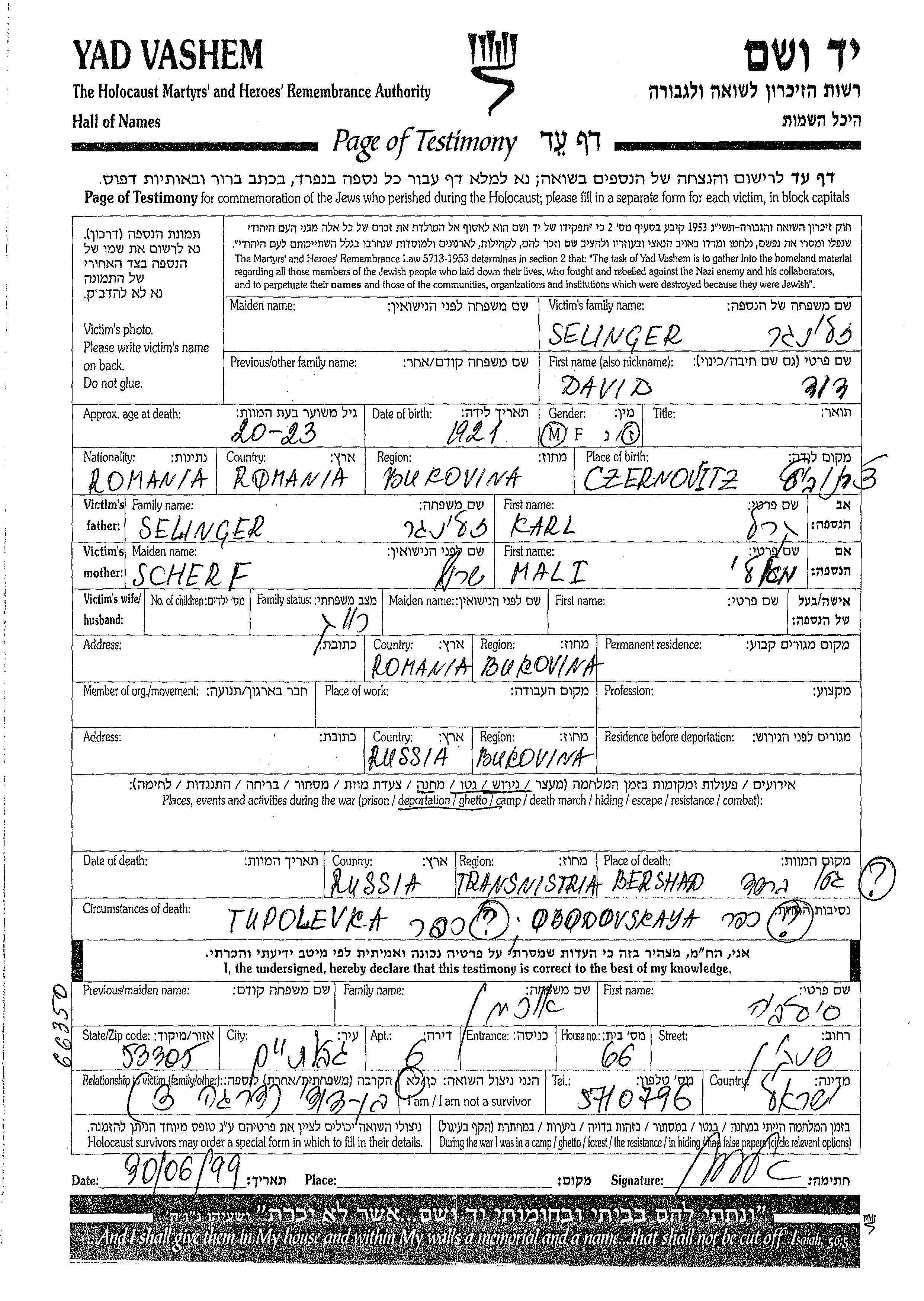 Давид Селингер, место рождения: Черновцы, Румыния. Отец: Карл, mать:Мали Мали. Холост / не замужем. Место жительства до войны: Буковина, Румыния. Место во время войны: Буковина, Румыния.