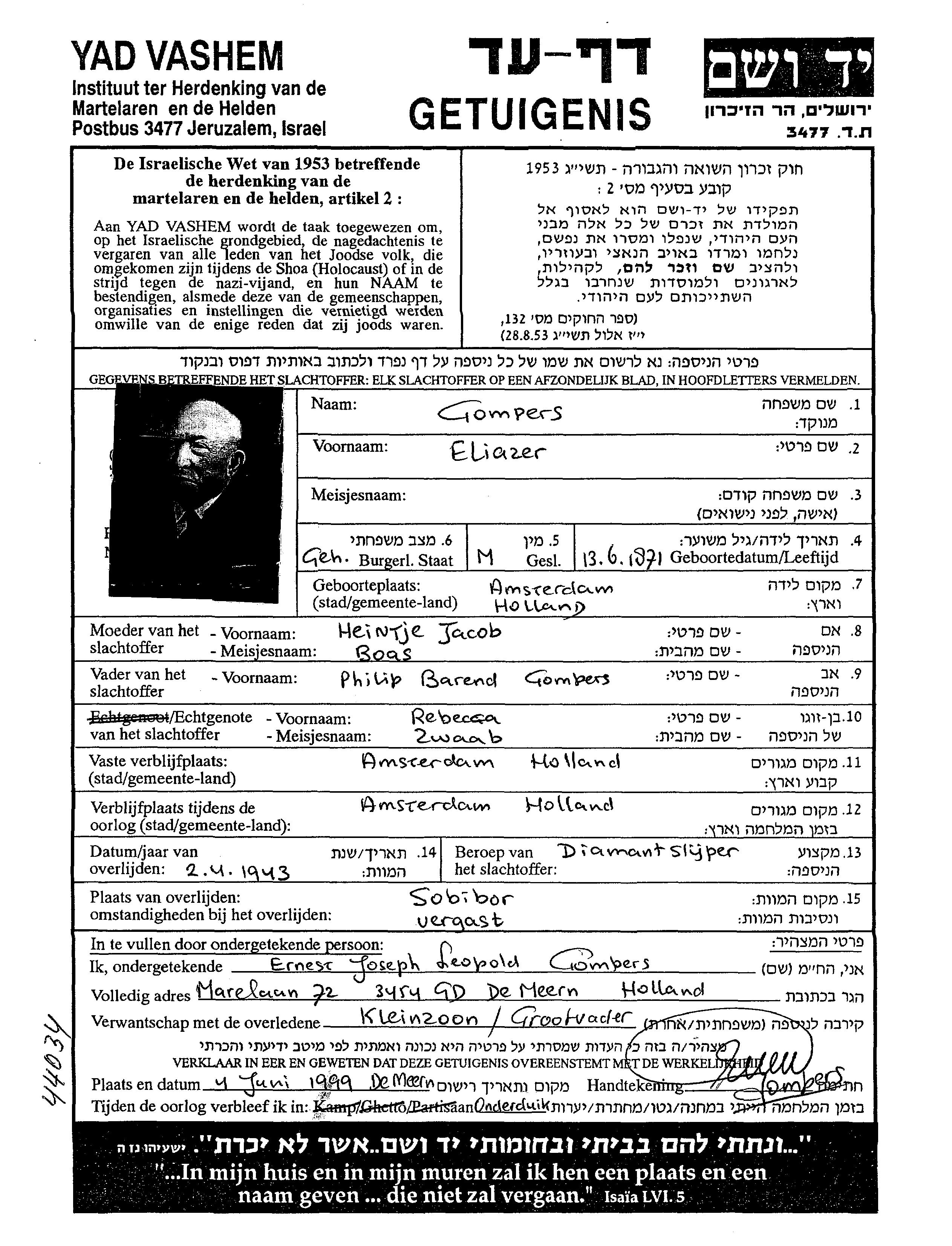 Элиазер Гомперс, место рождения: Амстердам, Нидерланды. Отец: Филип Баренд, mать:Хейнтье. Diamantenschleifer. Женат / замужем. Место жительства до войны: Амстердам, Нидерланды. Место во время войны: Амстердам, Нидерланды.