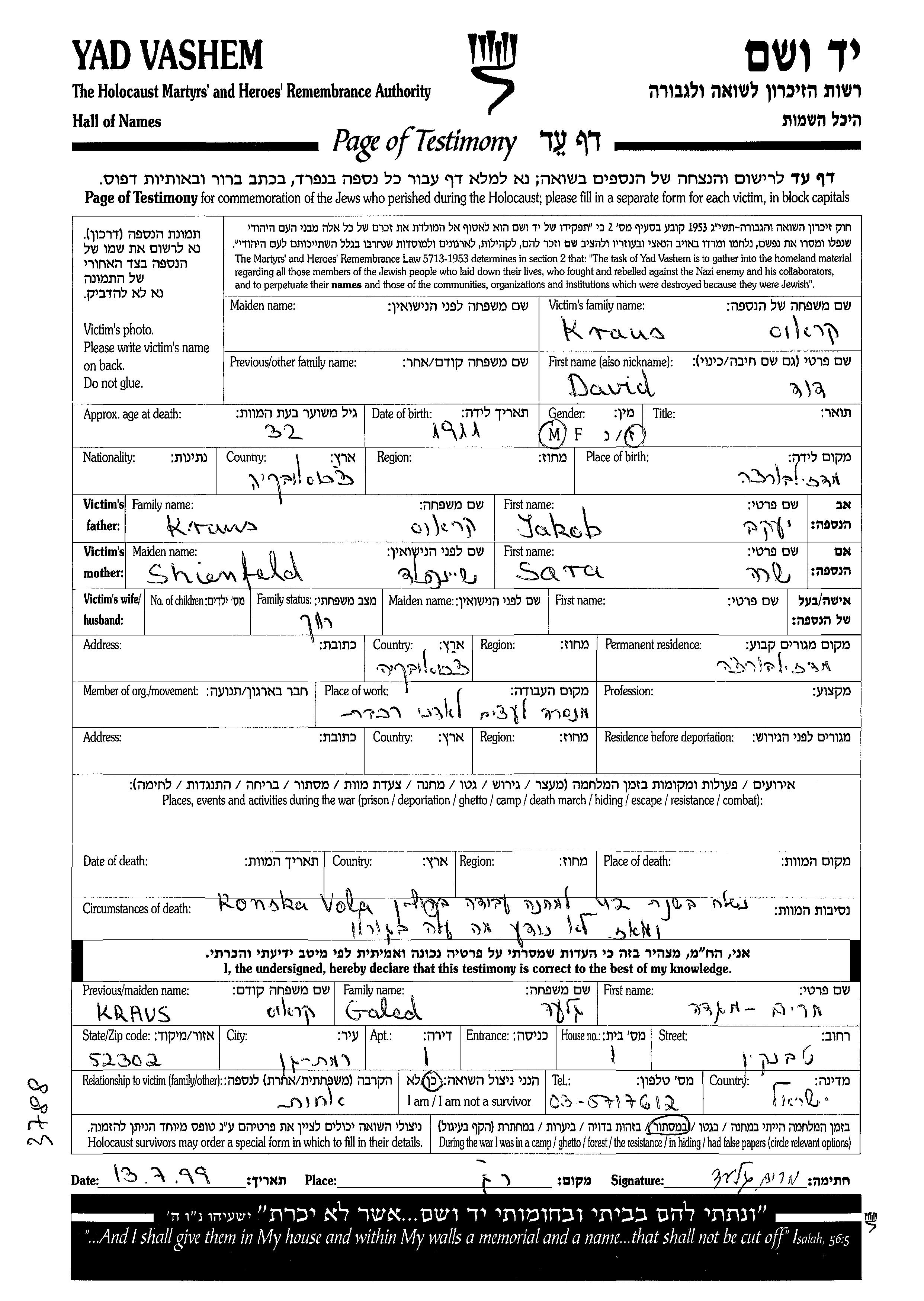 Давид Краус, место рождения: Медзилаборце, Чехословакия. Отец: Якоб, mать:Сара. Работник / работница лесопильного завода. Холост / не замужем. Место жительства до войны: Медзилаборце, Чехословакия. Место во время войны: Коньска Воля, Польша.