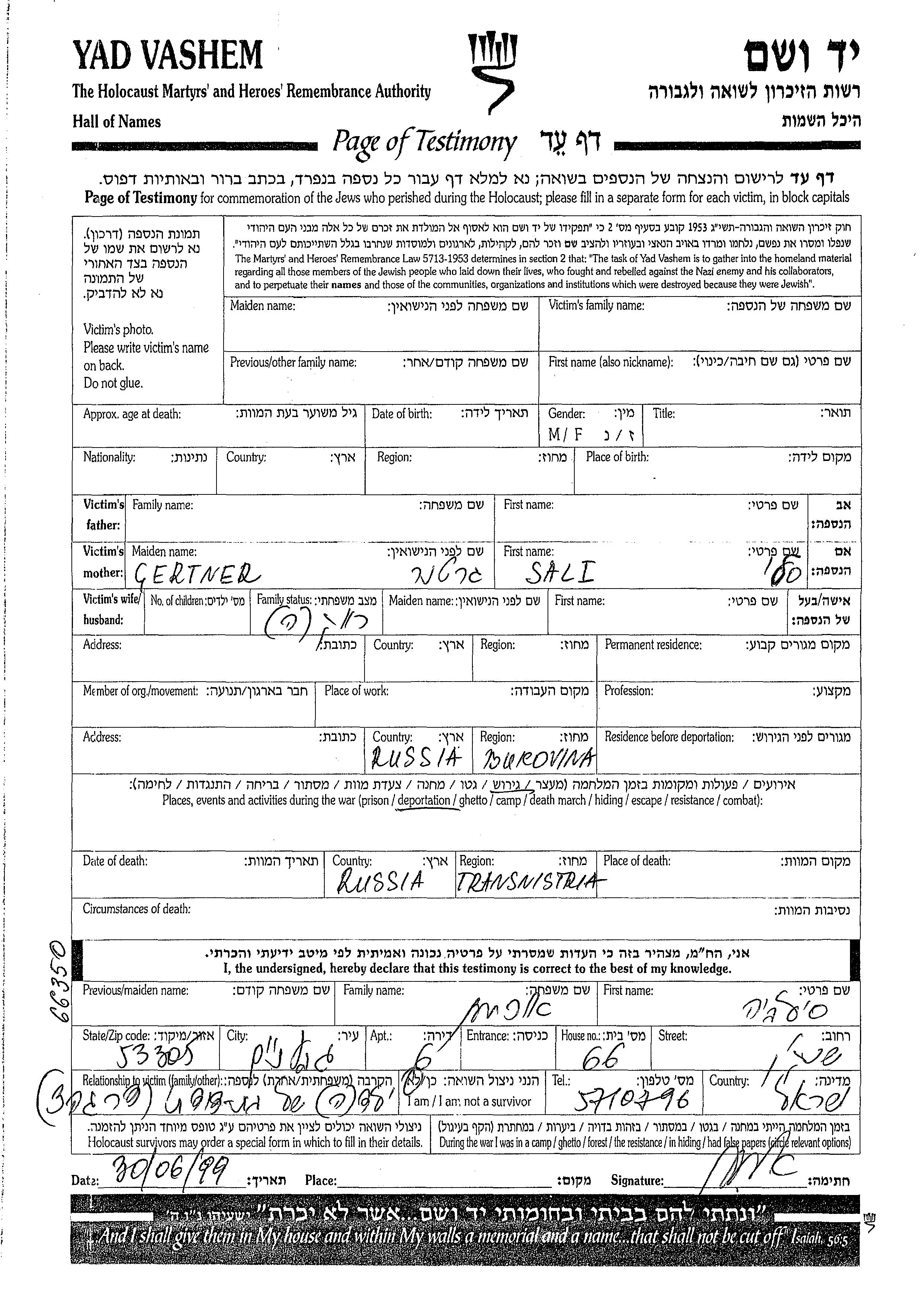 Яд Вашем - Листы свидетельских показаний Мемориального фонда