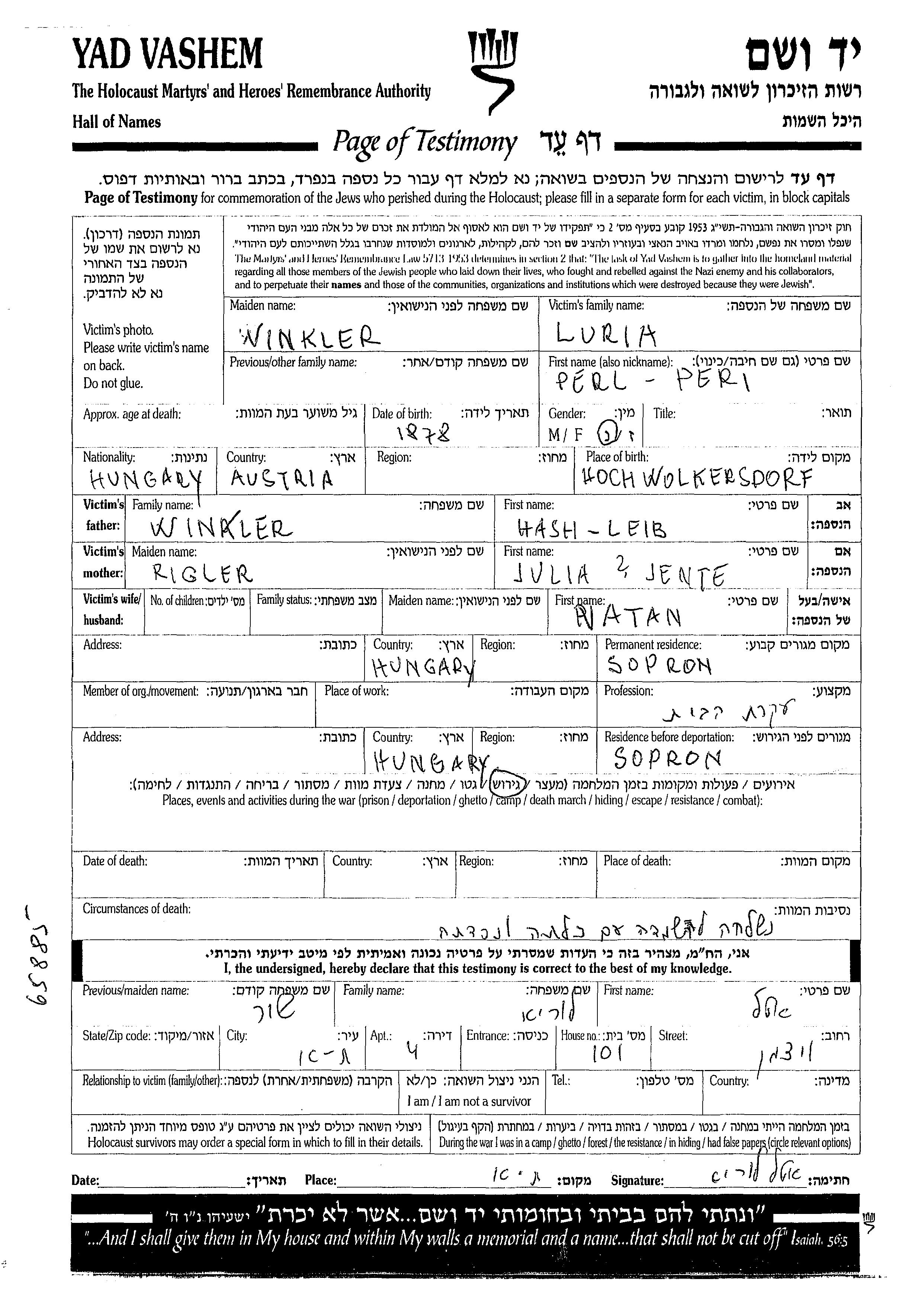 Перл Луриа, девичья фамилия Винклер, место рождения: Волькерсдорф, Австрия. Отец: Хаш Лейб, mать:Юлия Енте. Домохозяйка. Место жительства до войны: Шопрон, Венгрия. Место во время войны: Шопрон, Венгрия.