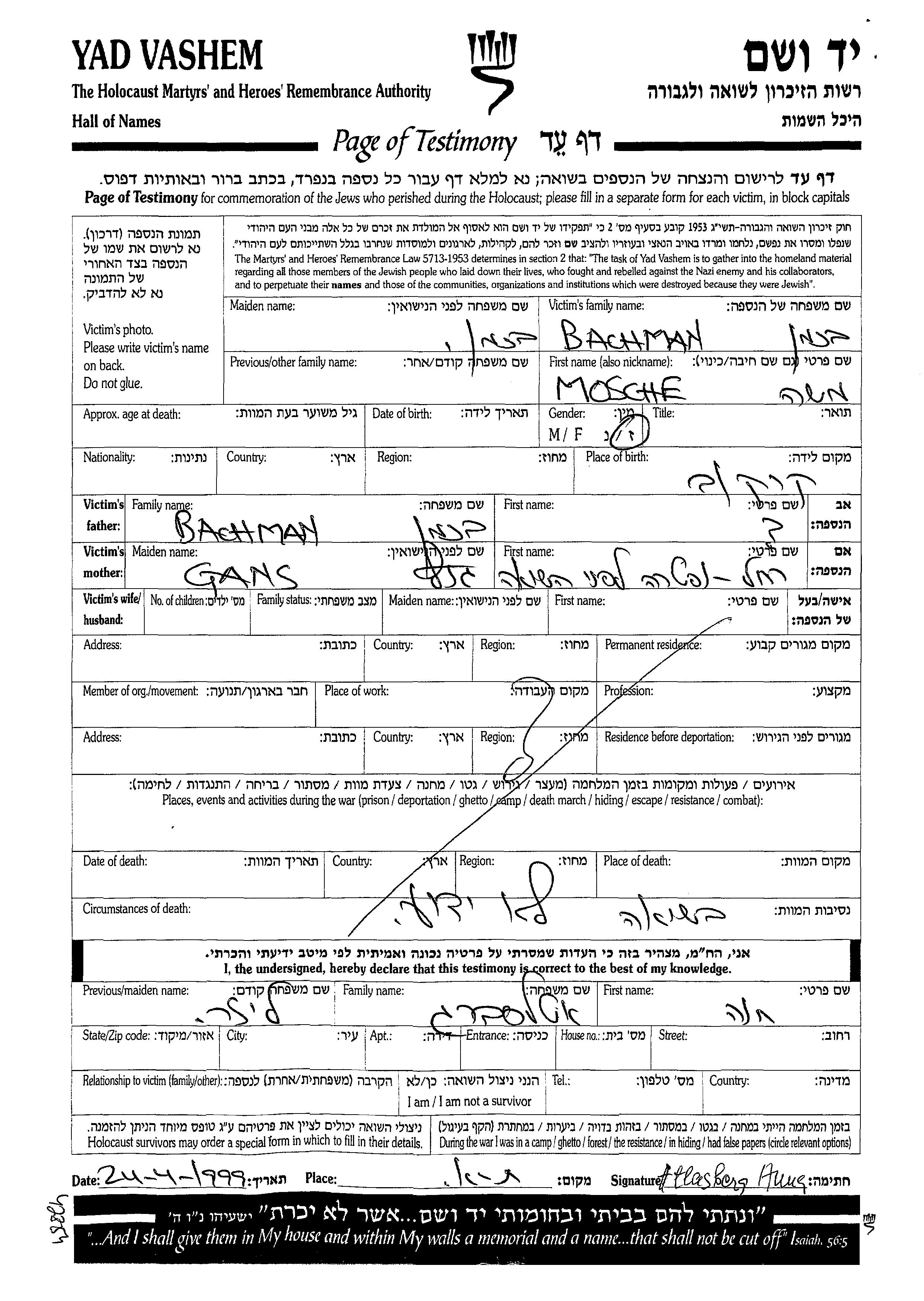 Бачман Бахман Моше место не указано, Лист свидетельских показаний