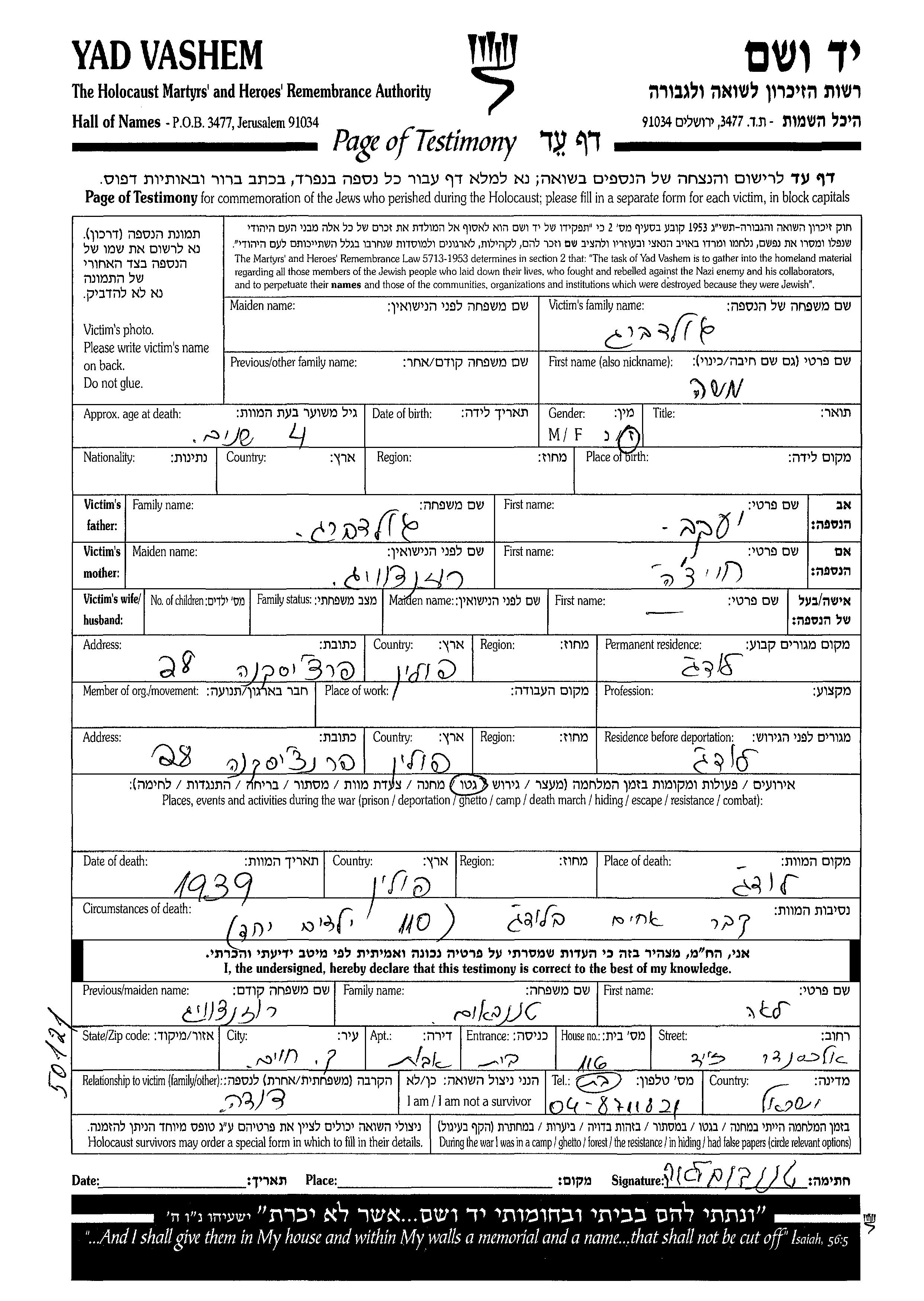 Яд Вашем - Листы свидетельских показаний Мемориального фонда