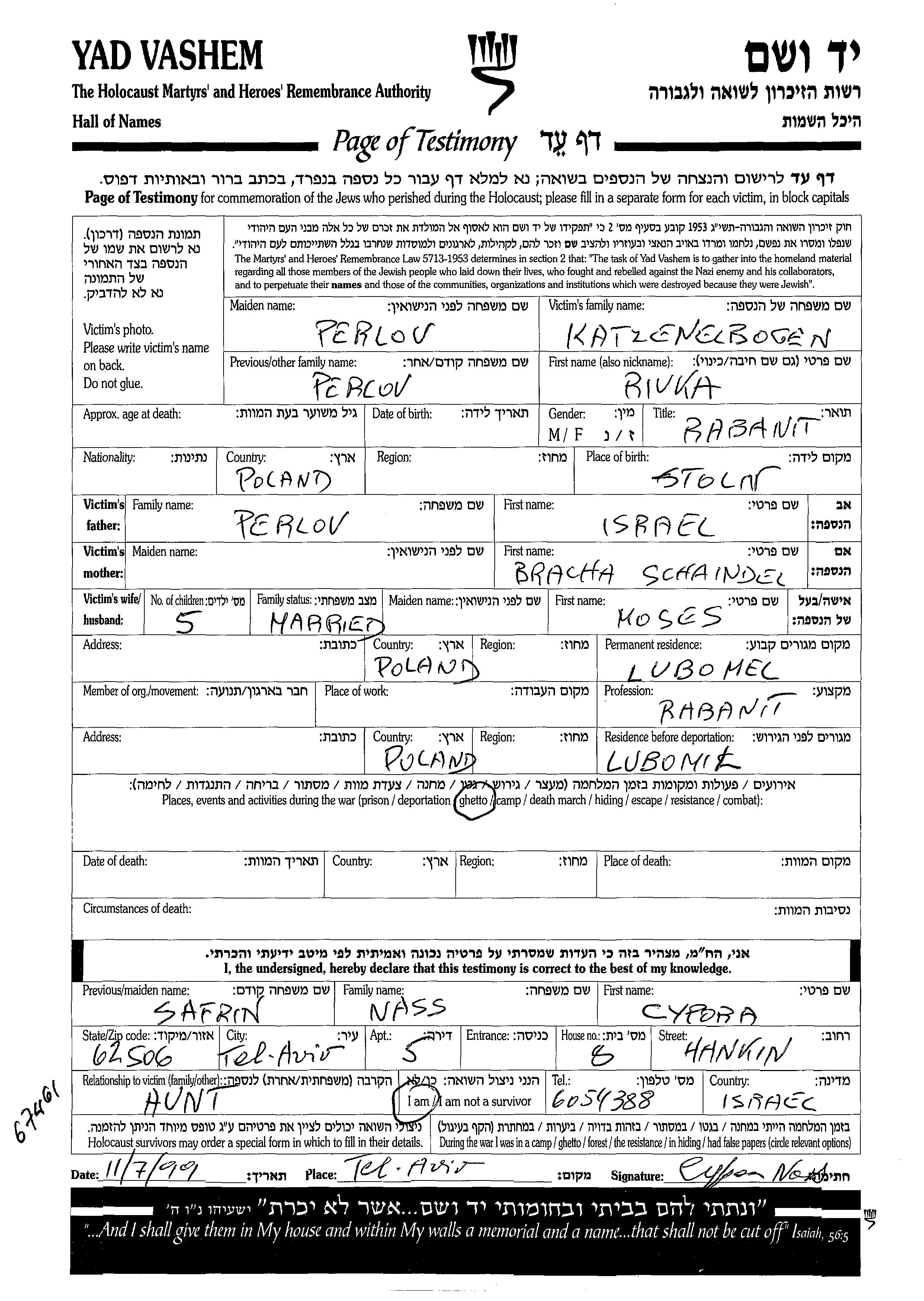 Ривка Каценельбоген, девичья фамилия Перлов, место рождения: Столин, Польша. Отец: Исраэль, mать:Браха Шайндел. Супруга раввина. Женат / замужем. Место жительства до войны: Любомель, Польша. Место во время войны: Любомиль, Польша.