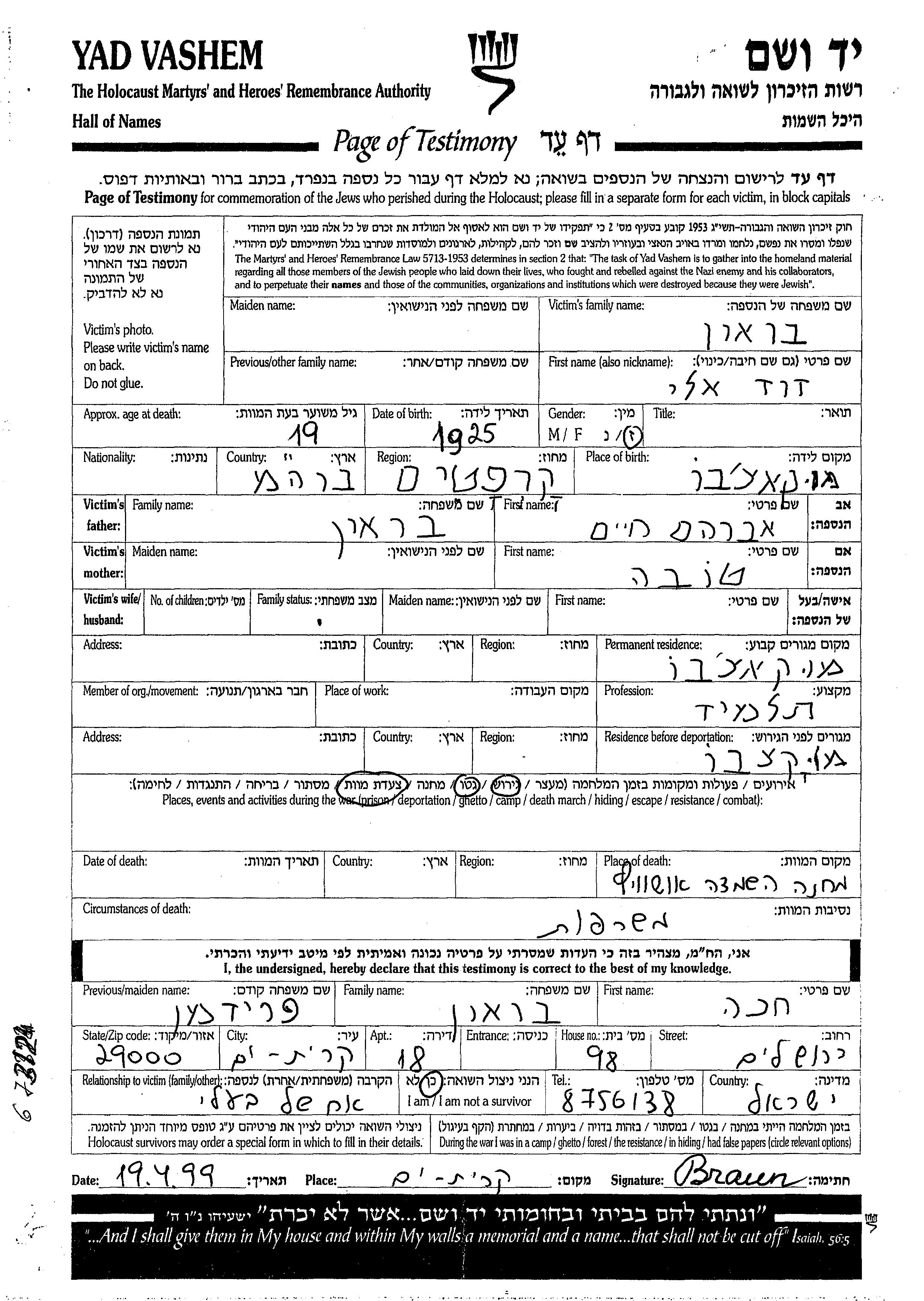 Браун Давид Эли 1925 Мукачево, Чехословакия Лист свидетельских показаний
