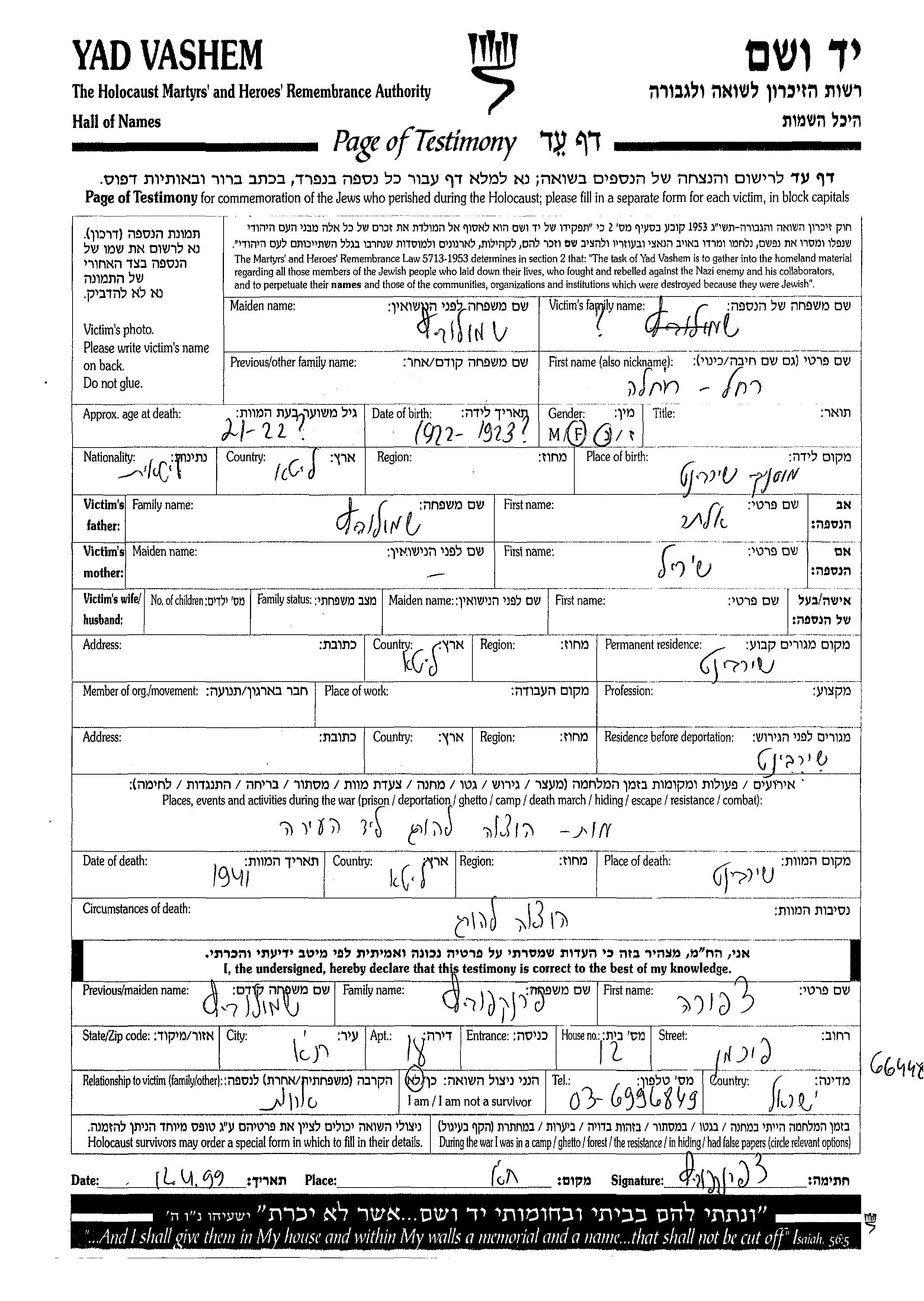 Фамилия неизвестна Рахель 1922 Ширвинт, Литва Лист свидетельских показаний