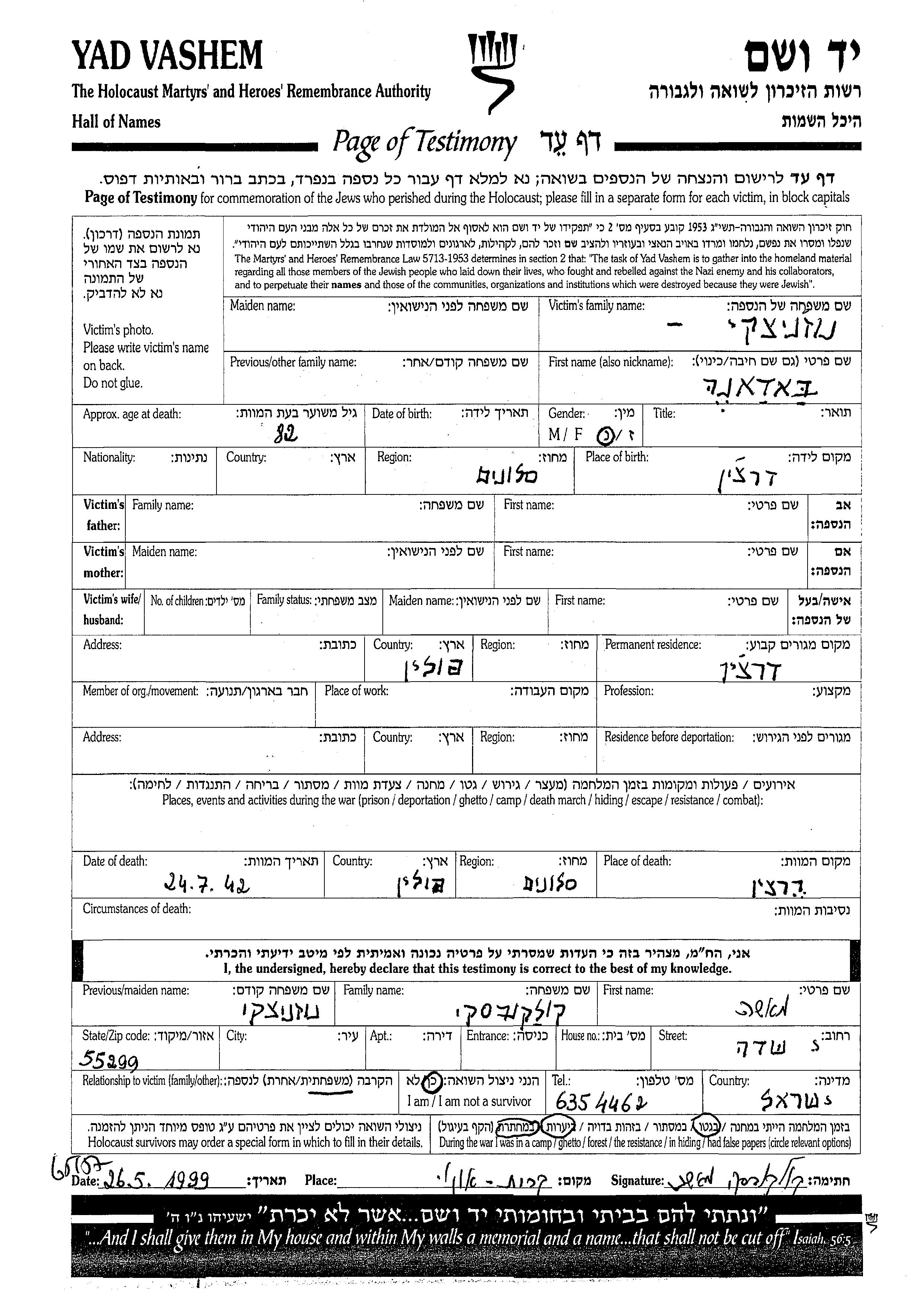 Яд Вашем - Листы свидетельских показаний Мемориального фонда