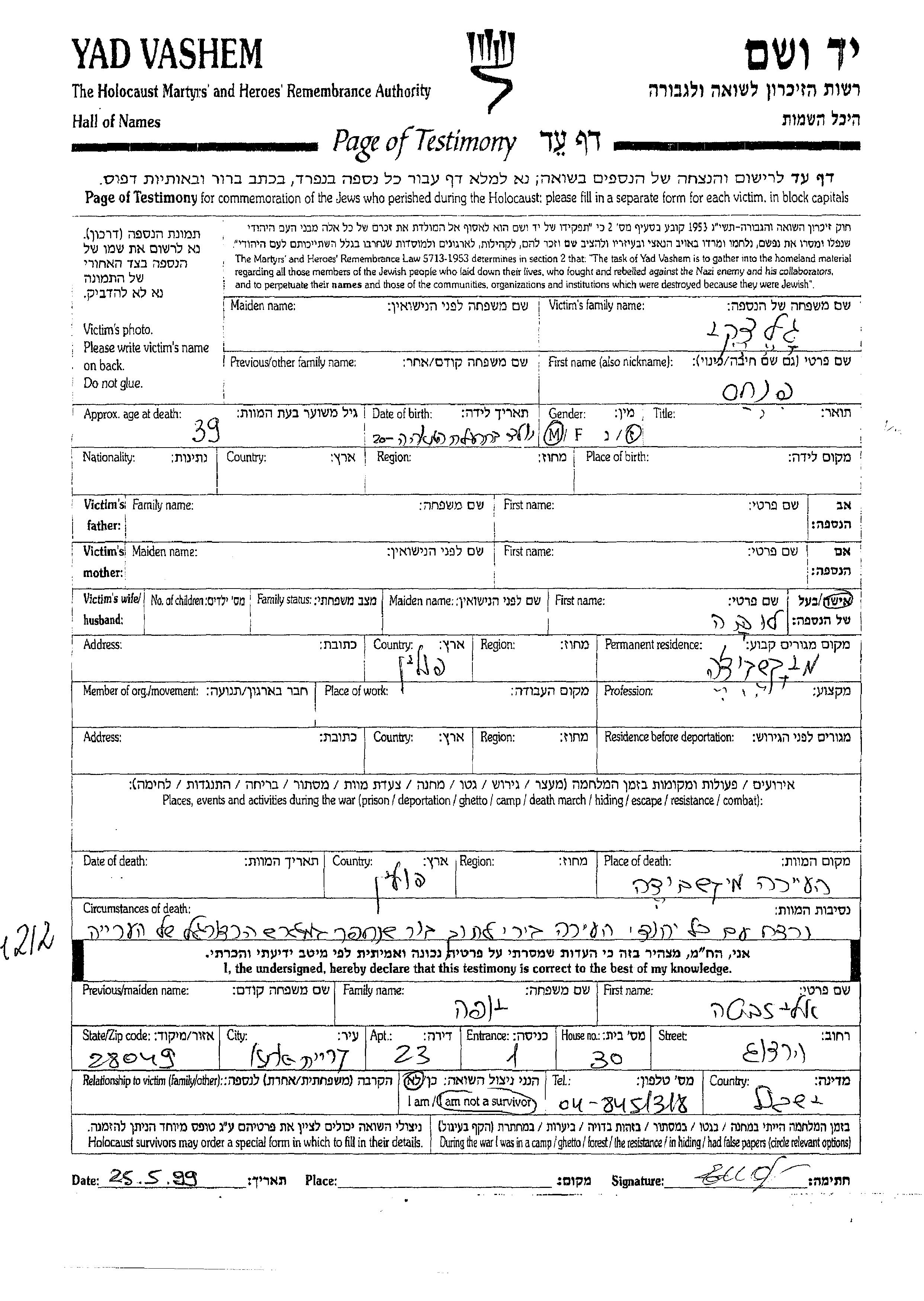 Яд Вашем - Листы свидетельских показаний Мемориального фонда