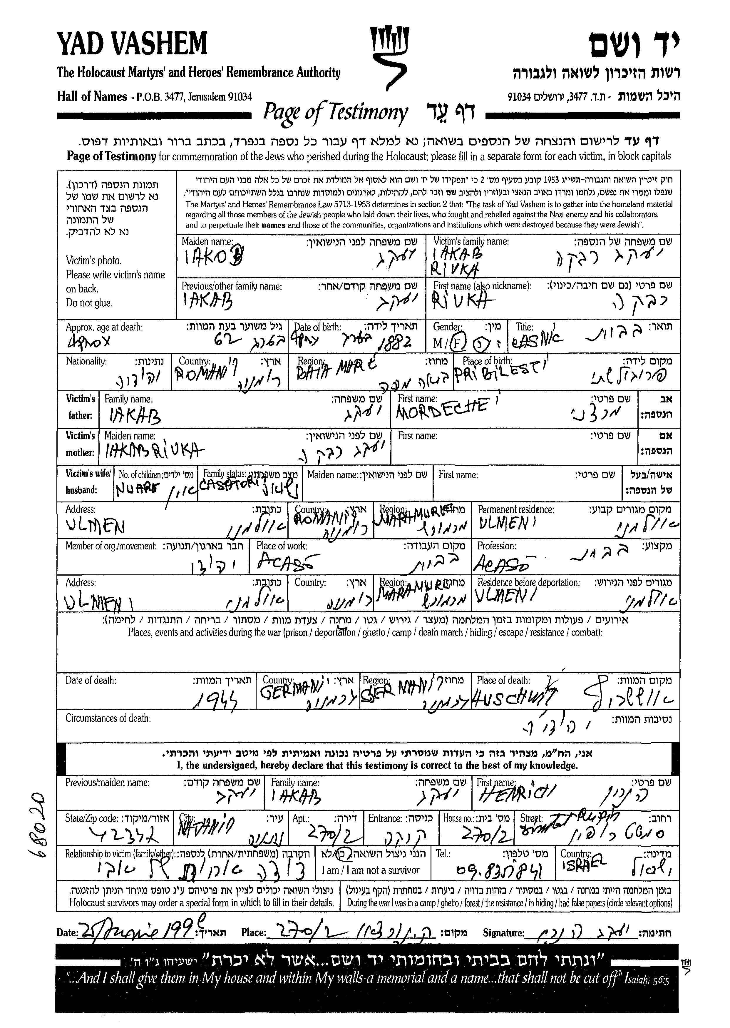 Ривка Якаб, место рождения: Прибилешть, Румыния. Домохозяйка. Женат / замужем. Место жительства до войны: Улмени, Румыния. Место во время войны: Улмени, Румыния.