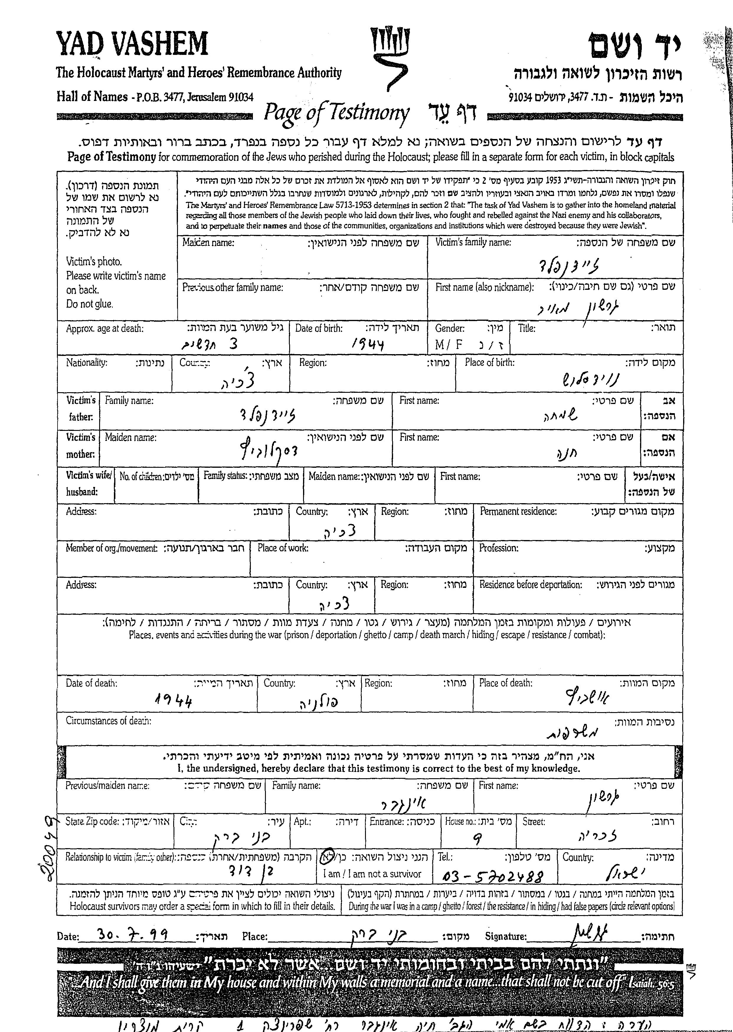 Яд Вашем - Листы свидетельских показаний Мемориального фонда