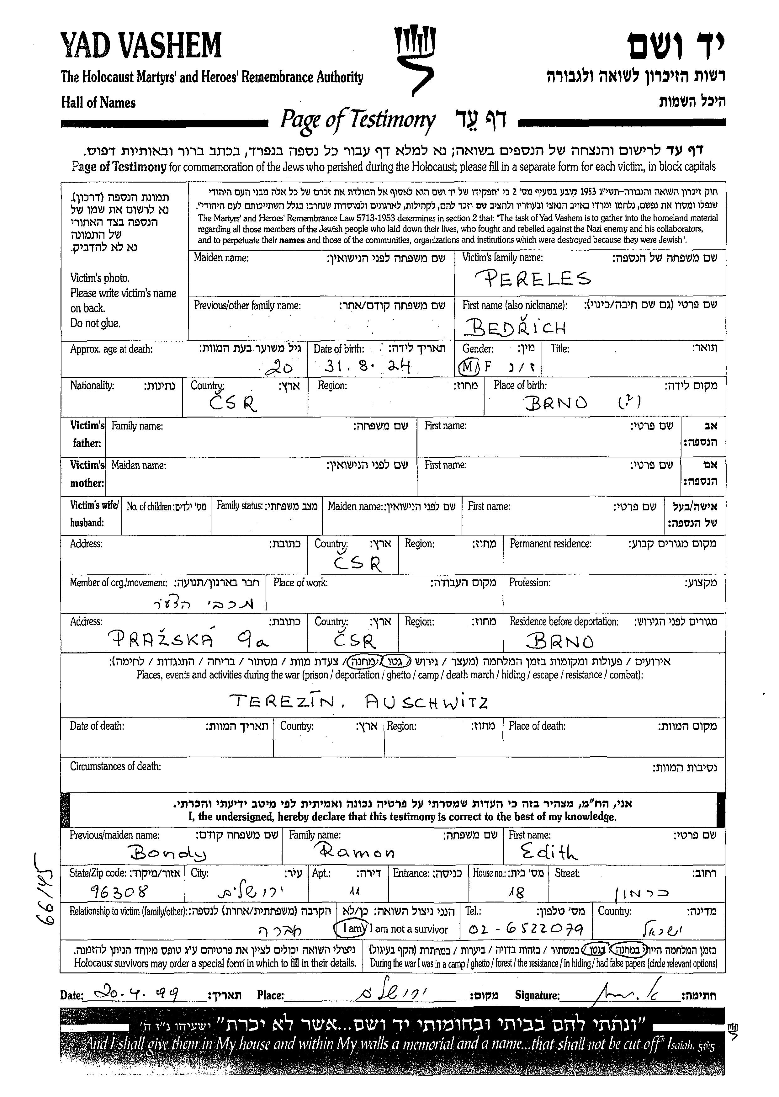 Бедрих Перелес, место рождения: Брно, Чехословакия. Место жительства до войны: Чехословакия. Место во время войны: Брно, Чехословакия.