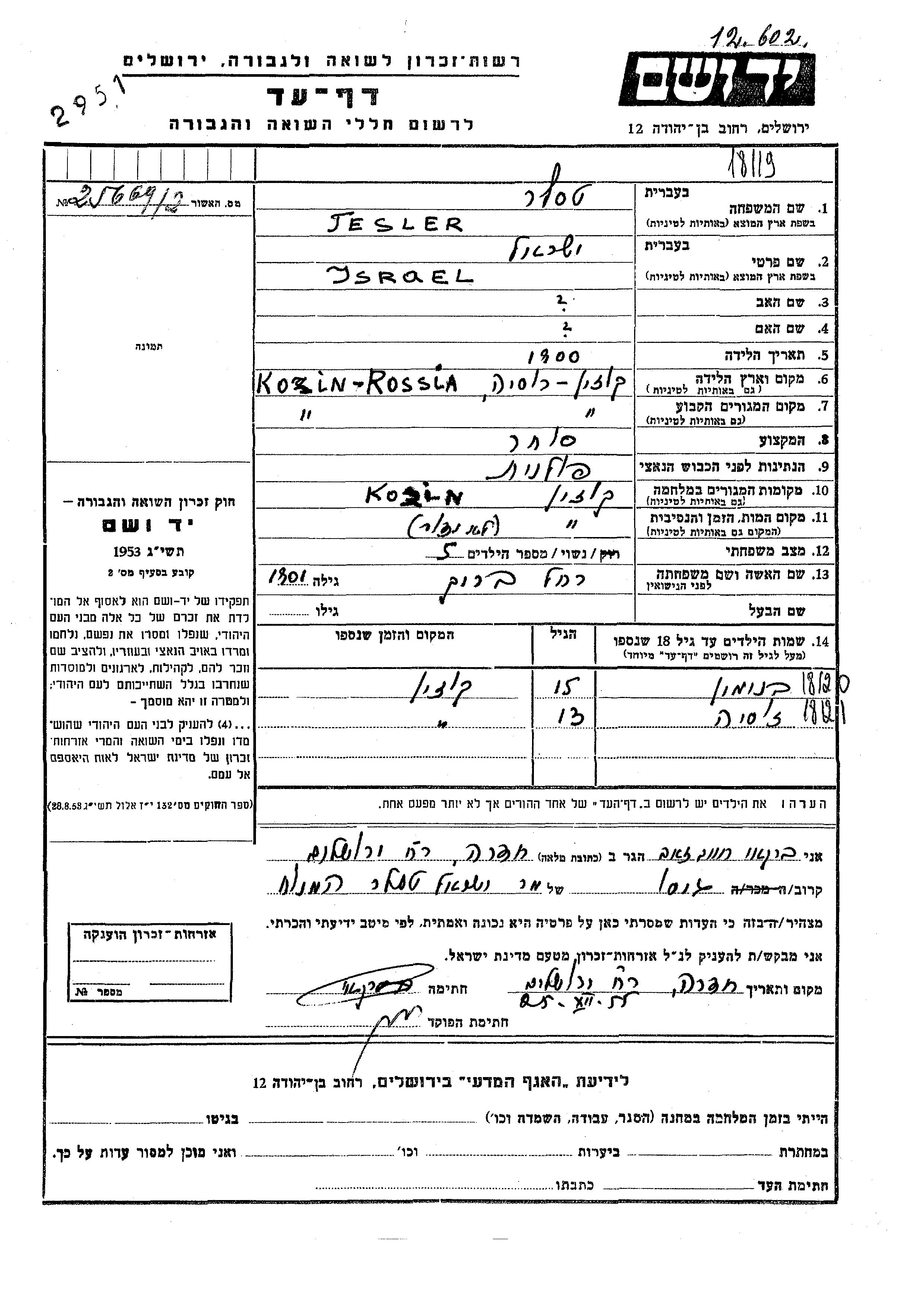 Теслер Исраэль 1900 Козин, Польша Лист свидетельских показаний