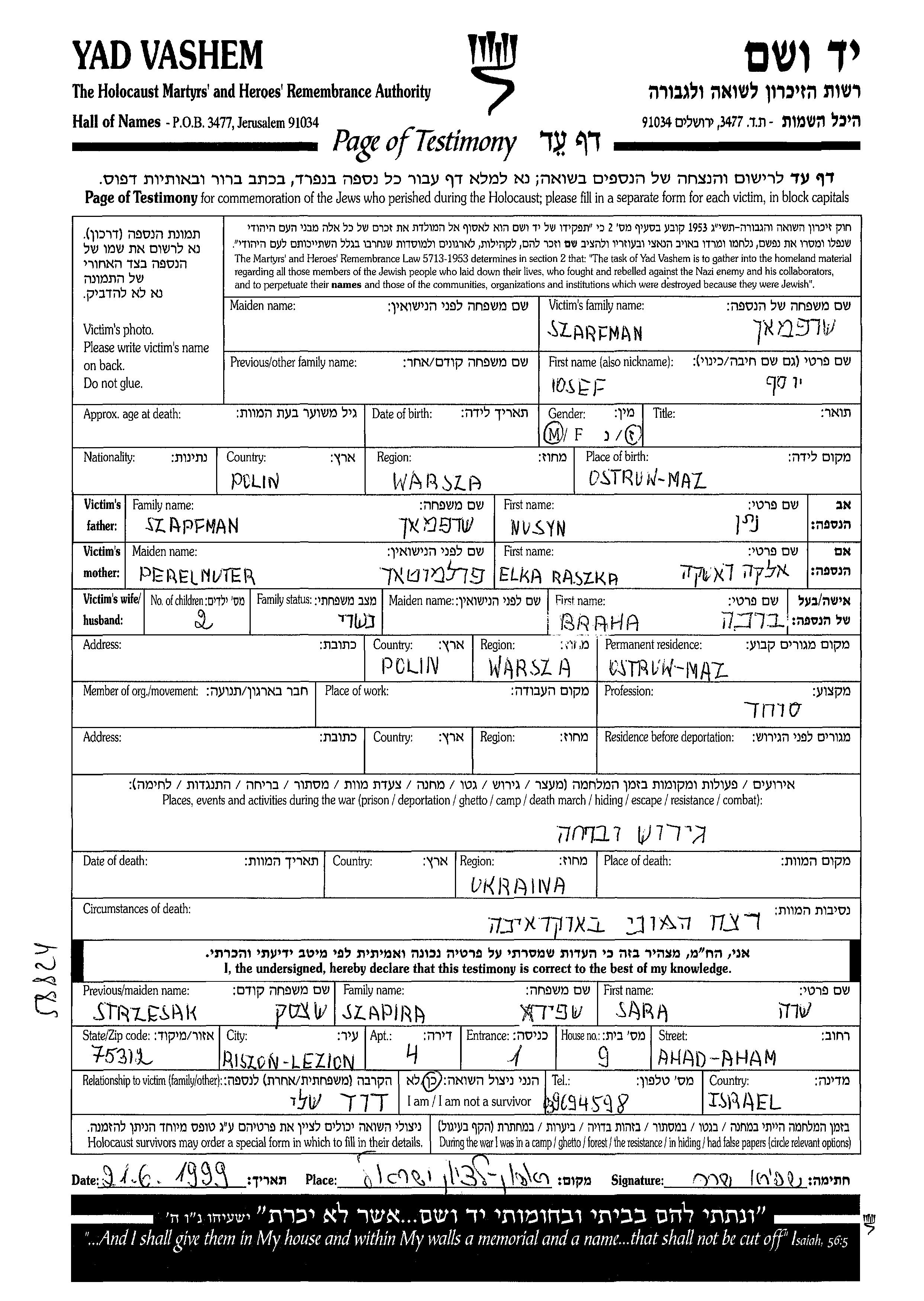 Шарфман Йосеф Острув-Мазовецка, Польша Лист свидетельских показаний