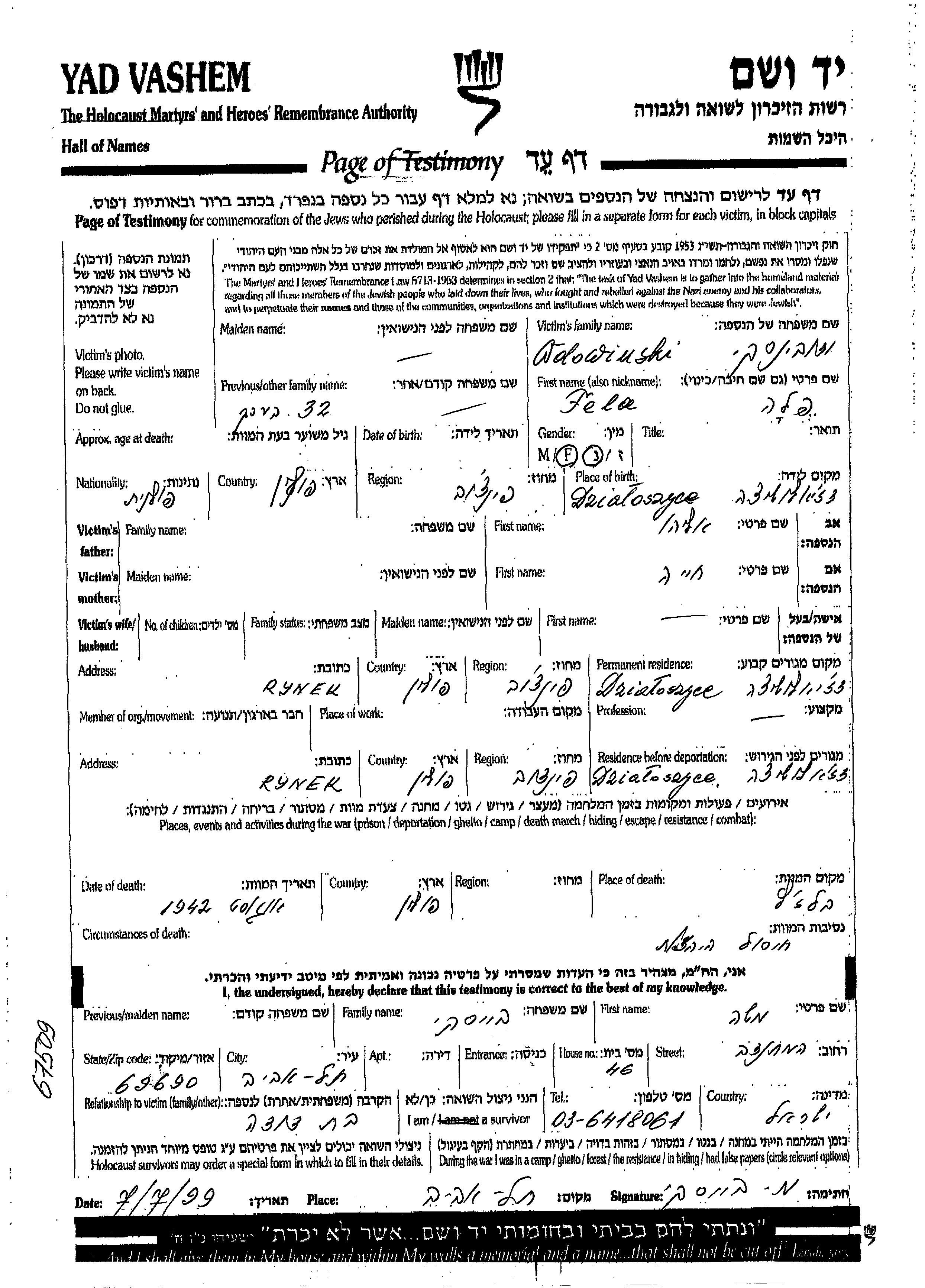 Фела Вдовински, место рождения: Дзялошице, Польша. Отец: Элиягу, mать:Хая. Место жительства до войны: Дзялошице, Польша. Место во время войны: Дзялошице, Польша.