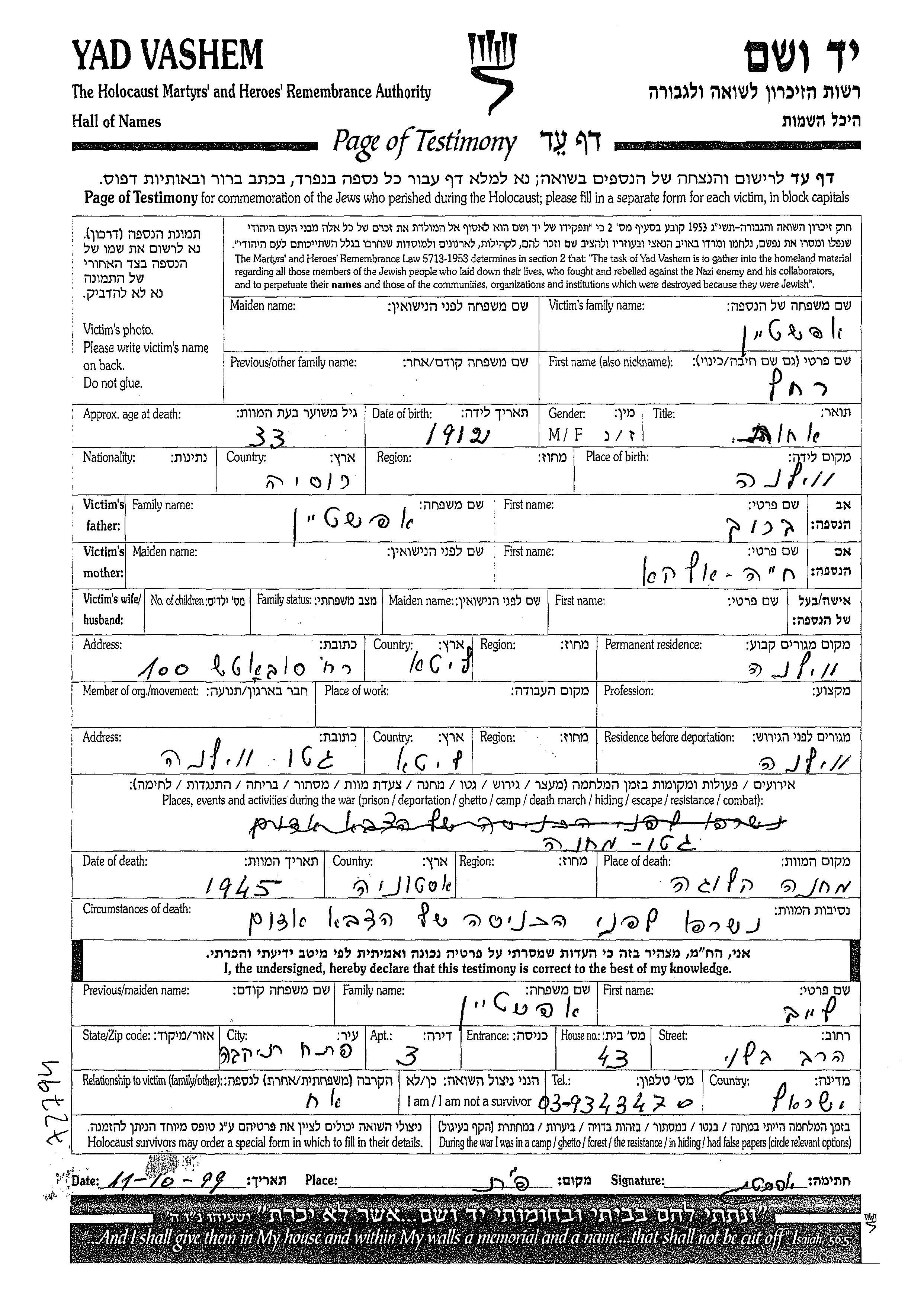 Яд Вашем - Листы свидетельских показаний Мемориального фонда