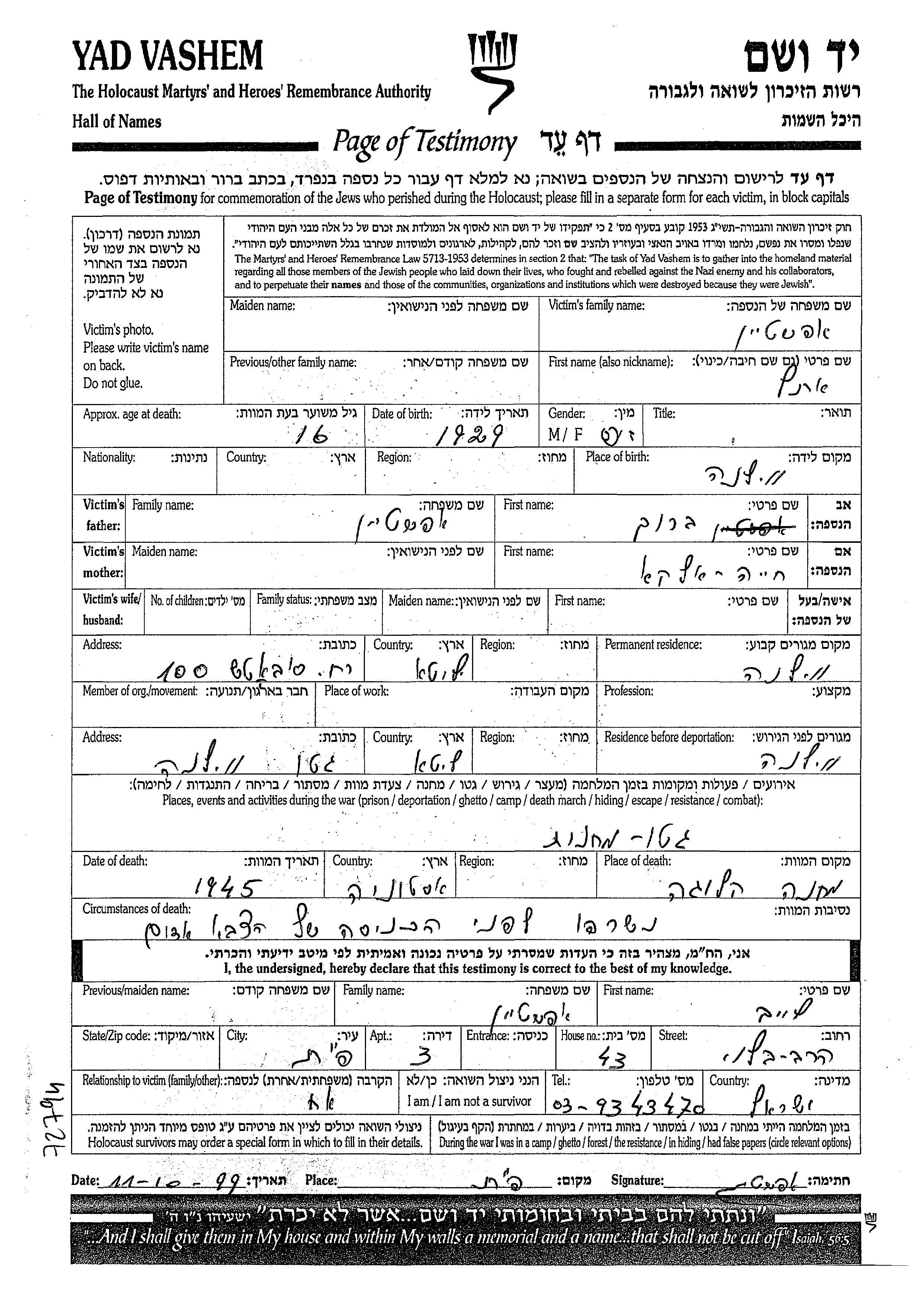 Эпштейн Этель 1929 Вильно, Польша Лист свидетельских показаний