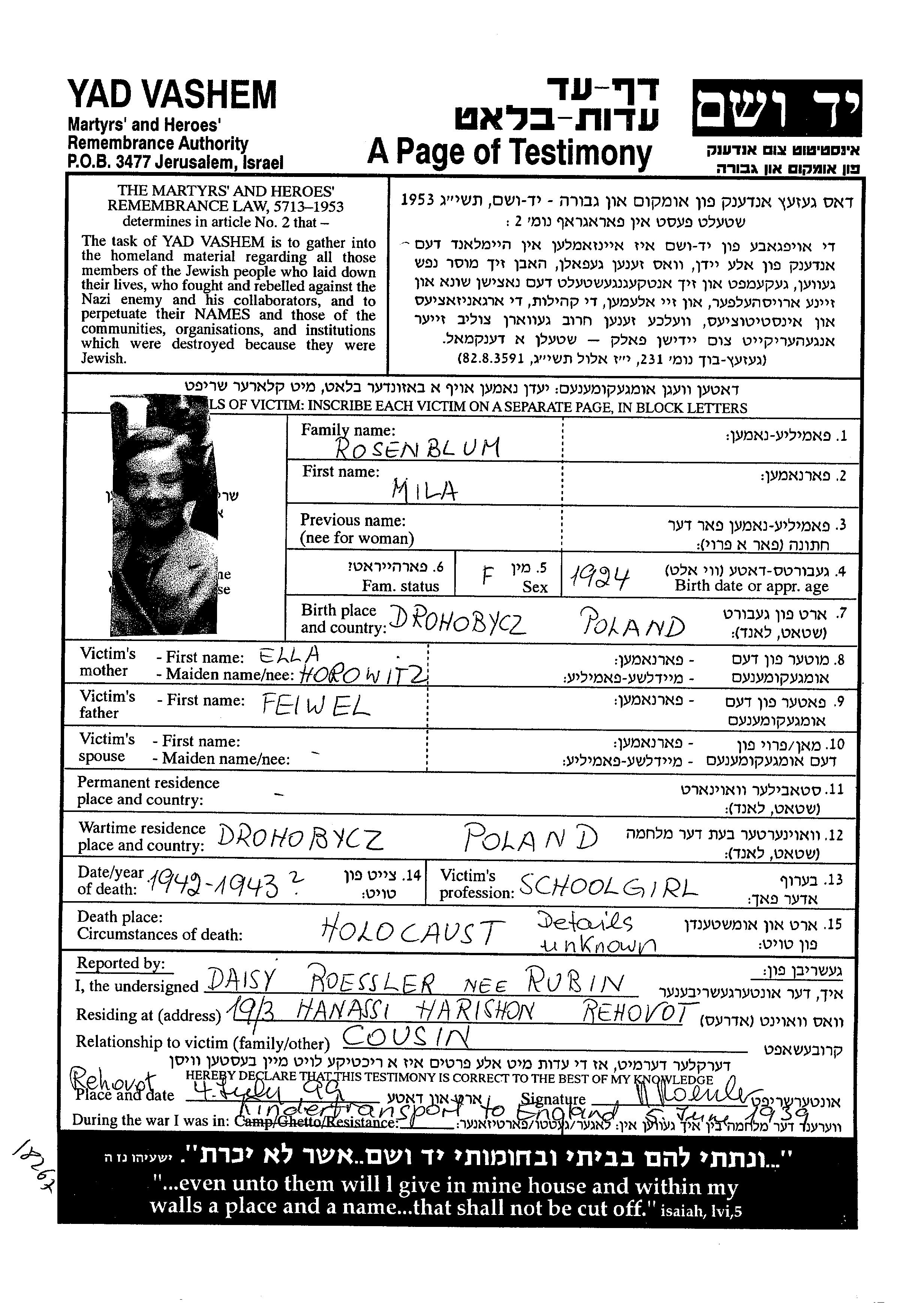 Мила Розенблюм, место рождения: Дрогобыч, Польша. Отец: Фейвел, mать:Элла. Школьник / школьница. Подросток. Место во время войны: Дрогобыч, Польша.