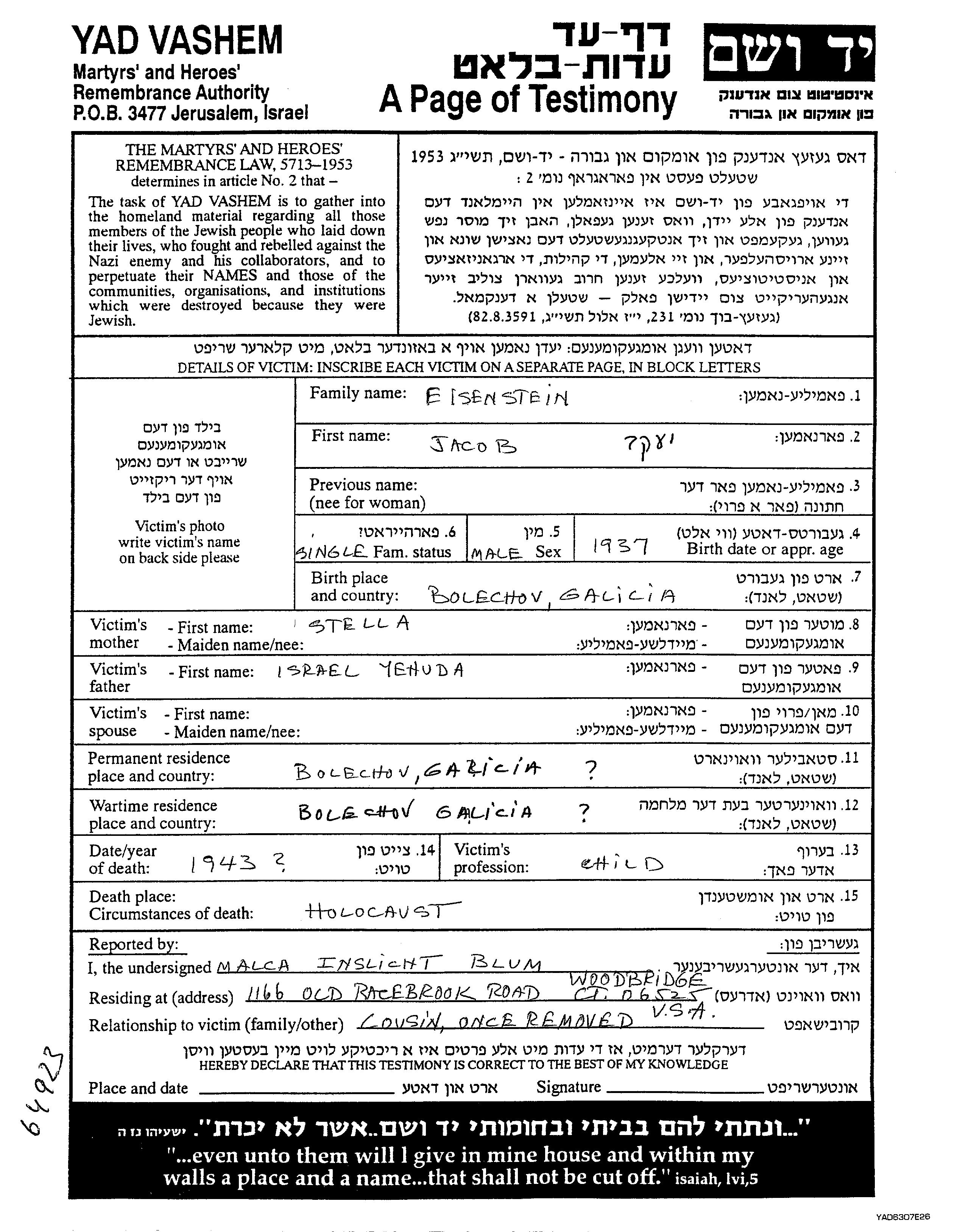 Якоб Айзенштайн, место рождения: Болехов, Польша. Отец: Исраэль Иегуда, mать:Стелла. Ребенок. Место жительства до войны: Болехов, Польша. Место во время войны: Болехов, Польша.