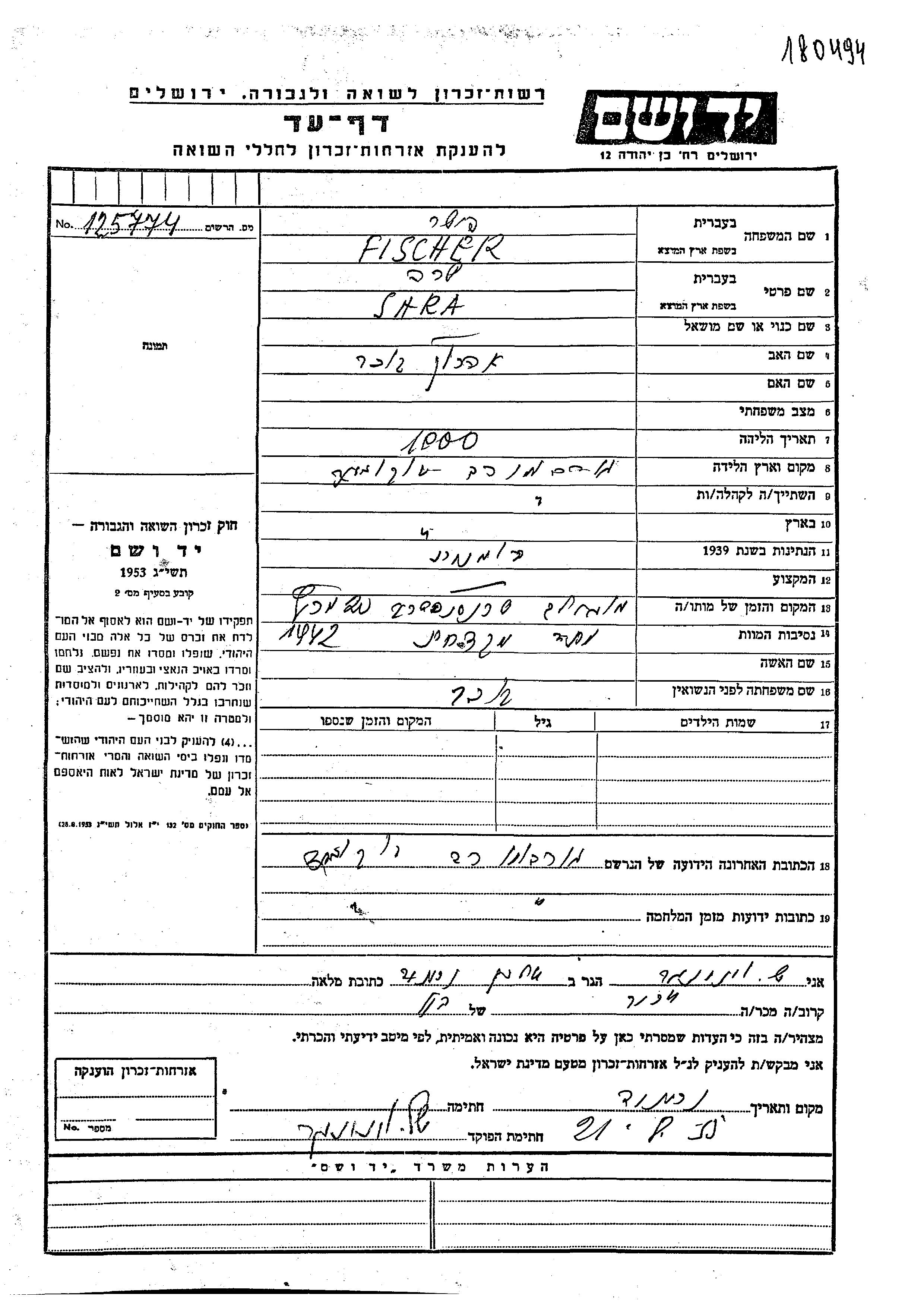 Сара Фишер, девичья фамилия Бухер, место рождения: Гурахумора, Румыния. Отец: Арон. Место жительства до войны: Гурахумора, Румыния. Место во время войны: Гурахумора, Румыния.