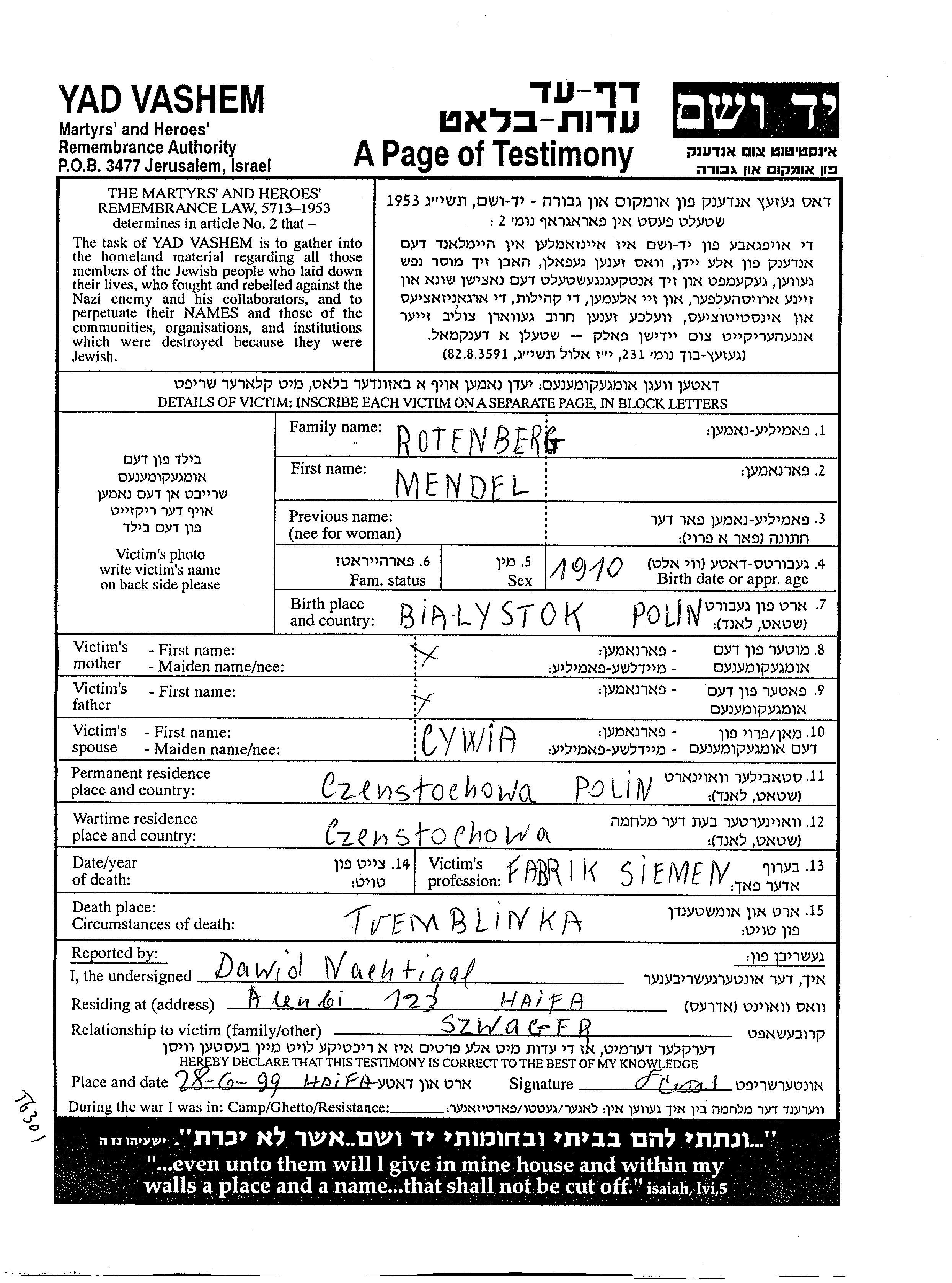 Мендель Ротенберг, место рождения: Белосток, Польша. Цементный завод. Женат / замужем. Место жительства до войны: Ченстохова, Польша. Место во время войны: Ченстохова, Польша.
