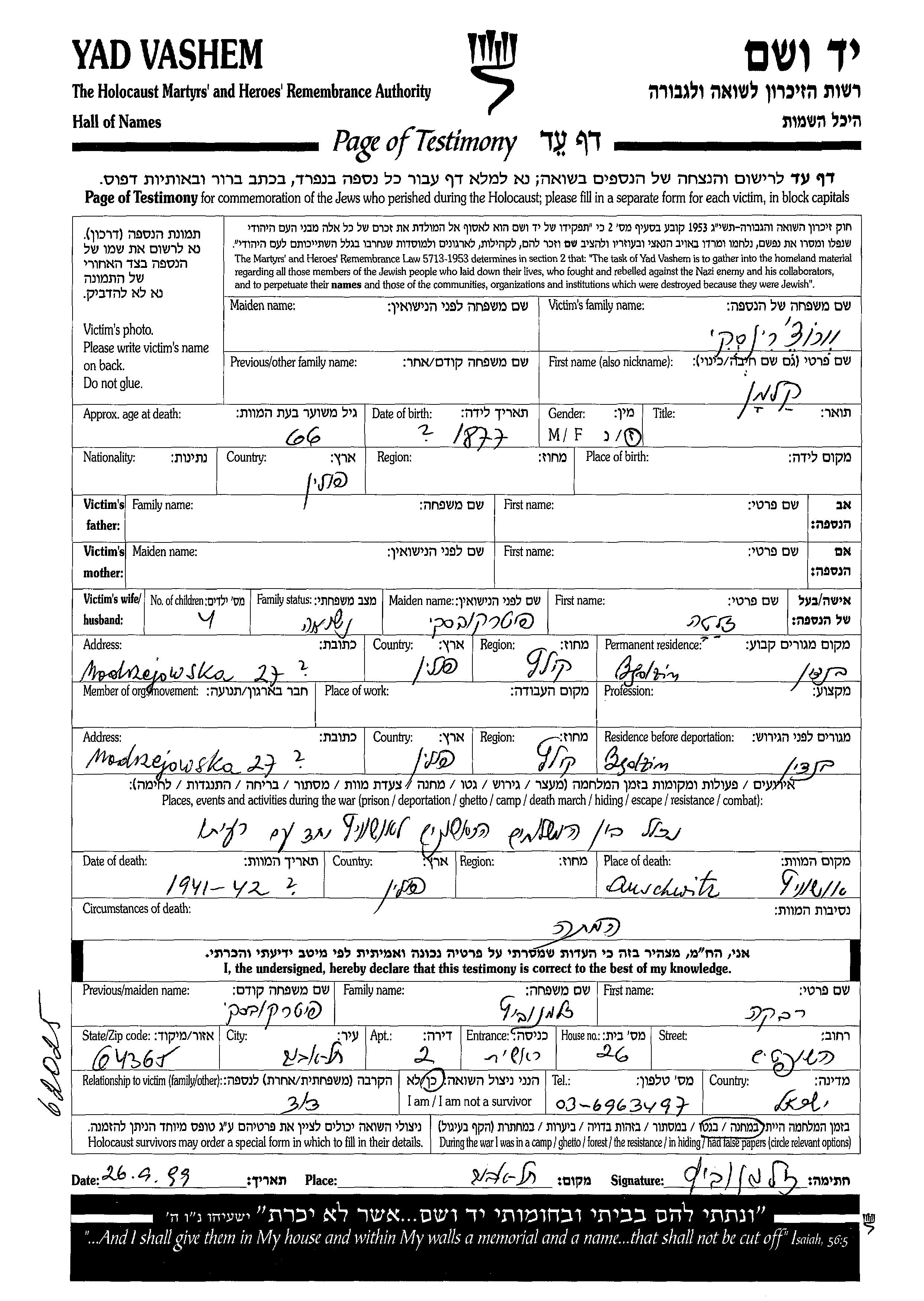 Кальман Врочеринский, место рождения: Польша. Женат / замужем. Место жительства до войны: Бендзин, Польша. Место во время войны: Бендзин, Польша.