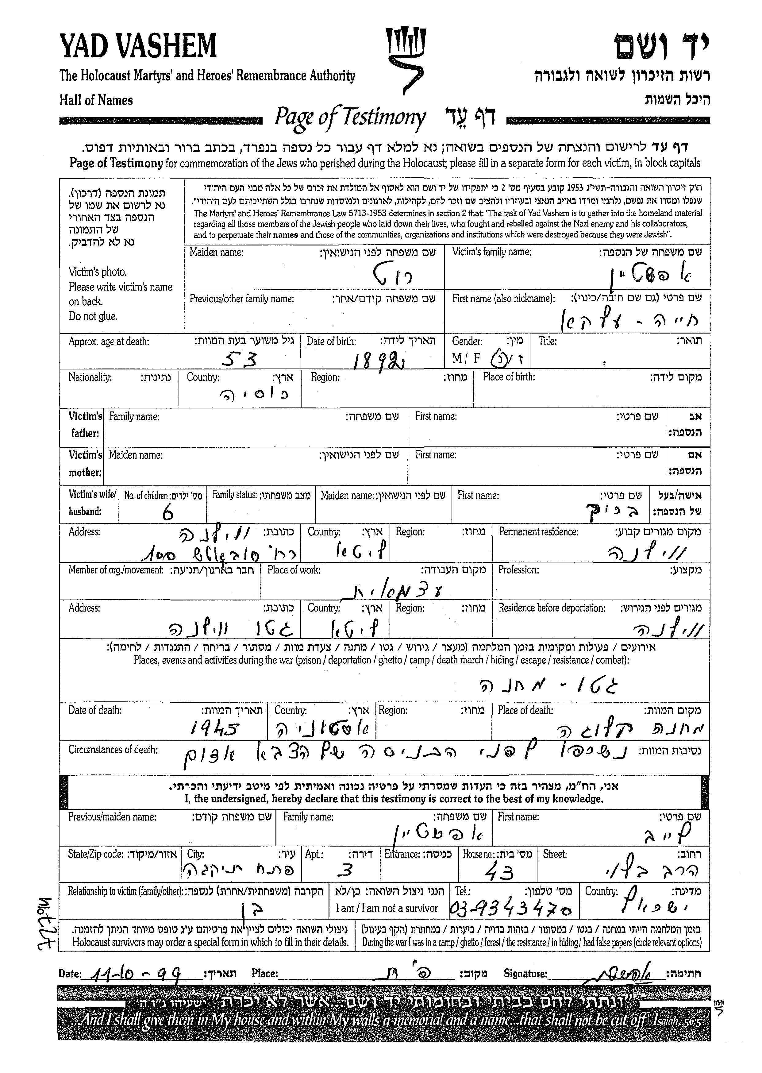 Яд Вашем - Листы свидетельских показаний Мемориального фонда
