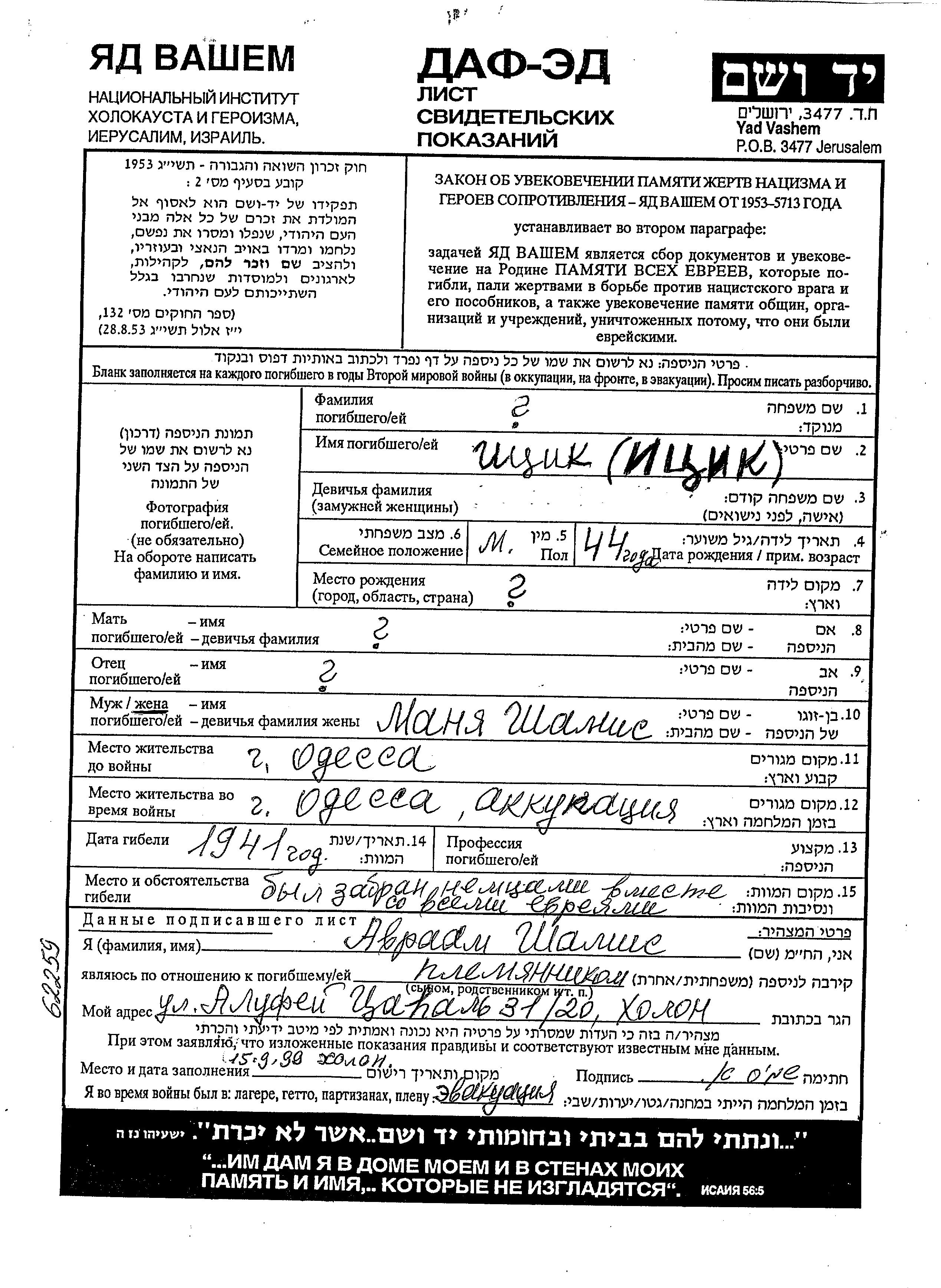 Фамилия неизвестна Ицик Одесса, Украина (СССР) Лист свидетельских показаний