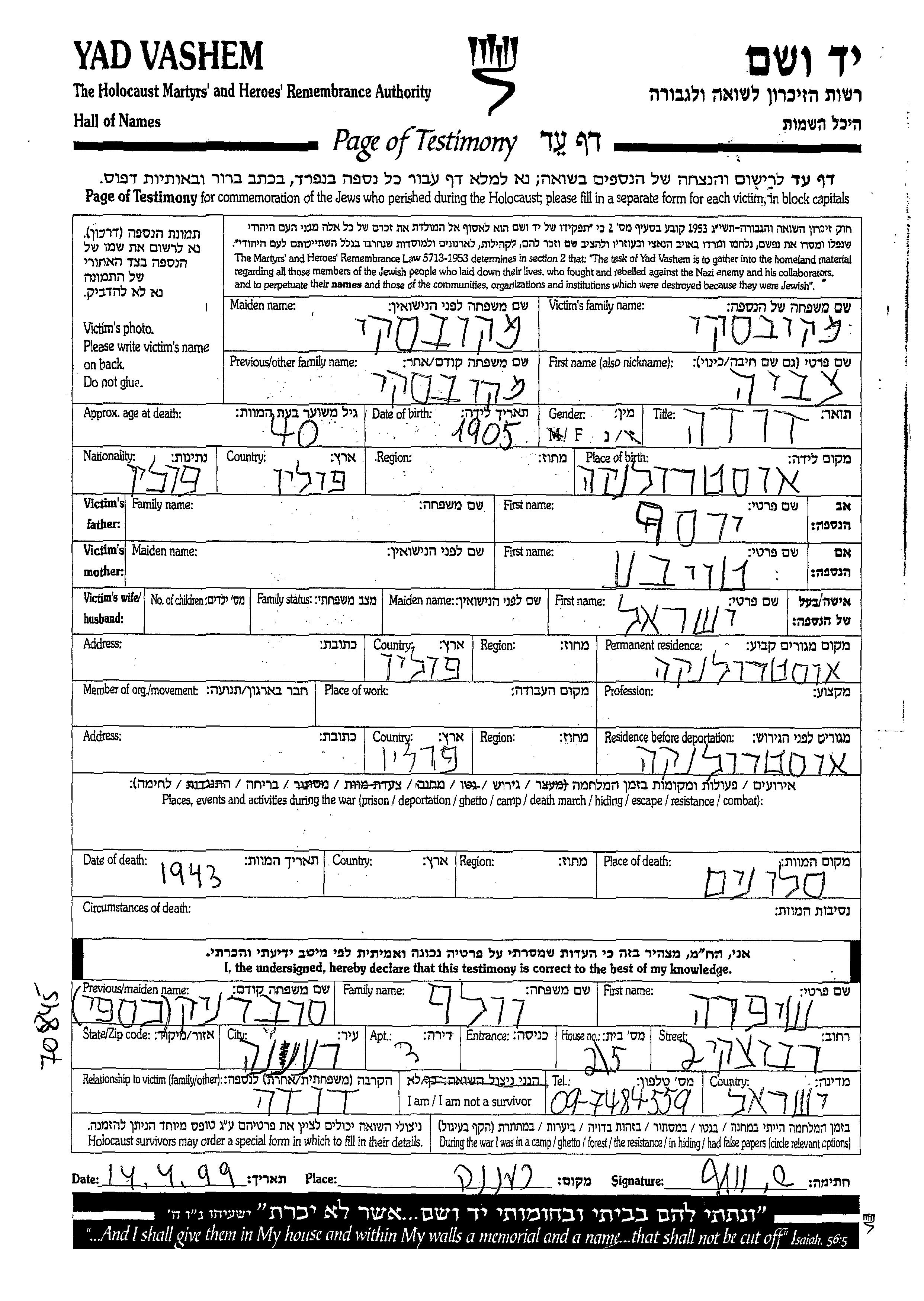Цвия уничтоженa в период Шоа. место смерти: Слоним, Польша в 1943.