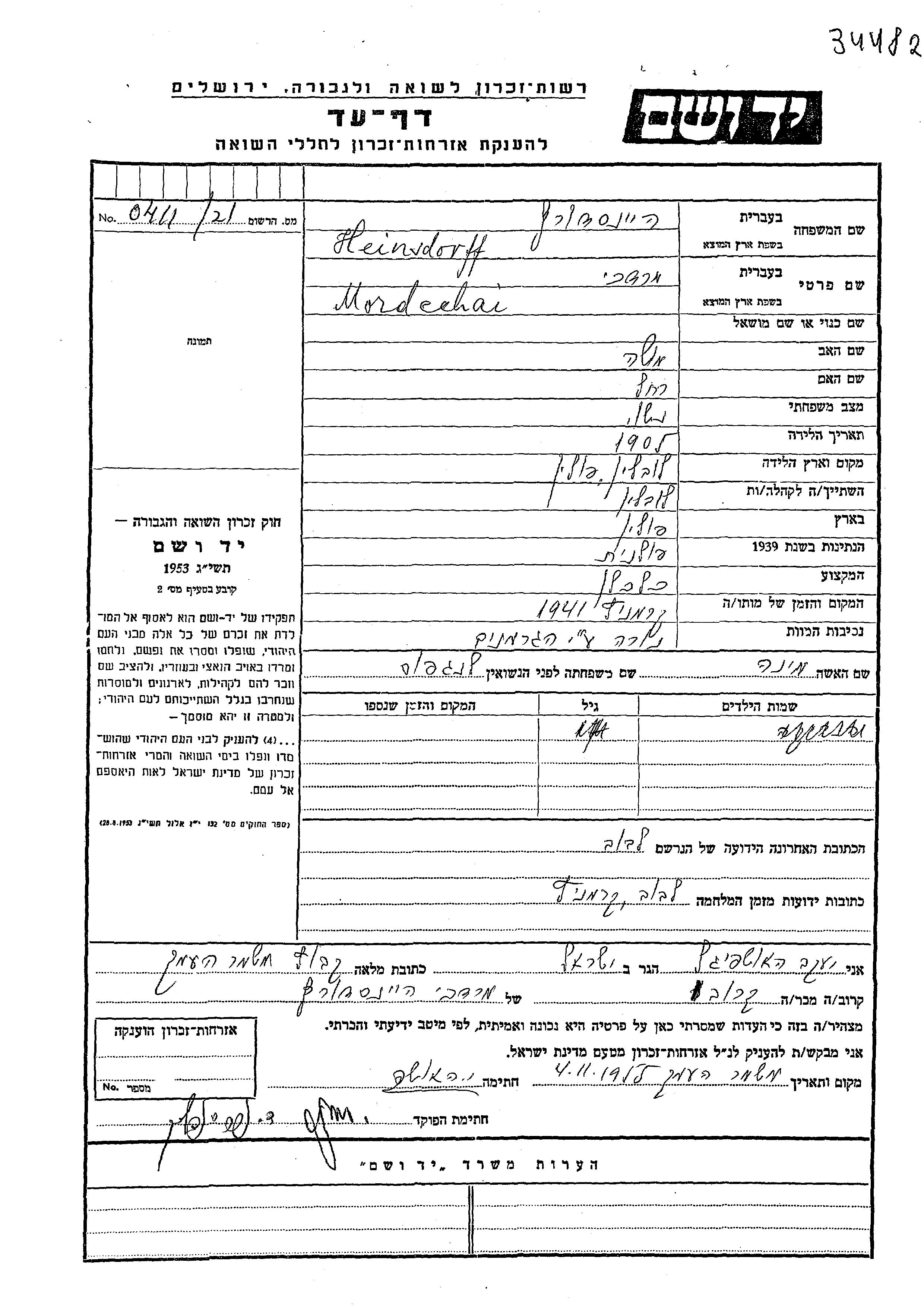 Мордехай Хайнсдорфф, место рождения: Люблин, Польша. Отец: Моше, mать:Рахель. Экономист. Женат / замужем. Место жительства до войны: Лублау, Чехословакия. Место во время войны: Львов, Польша.