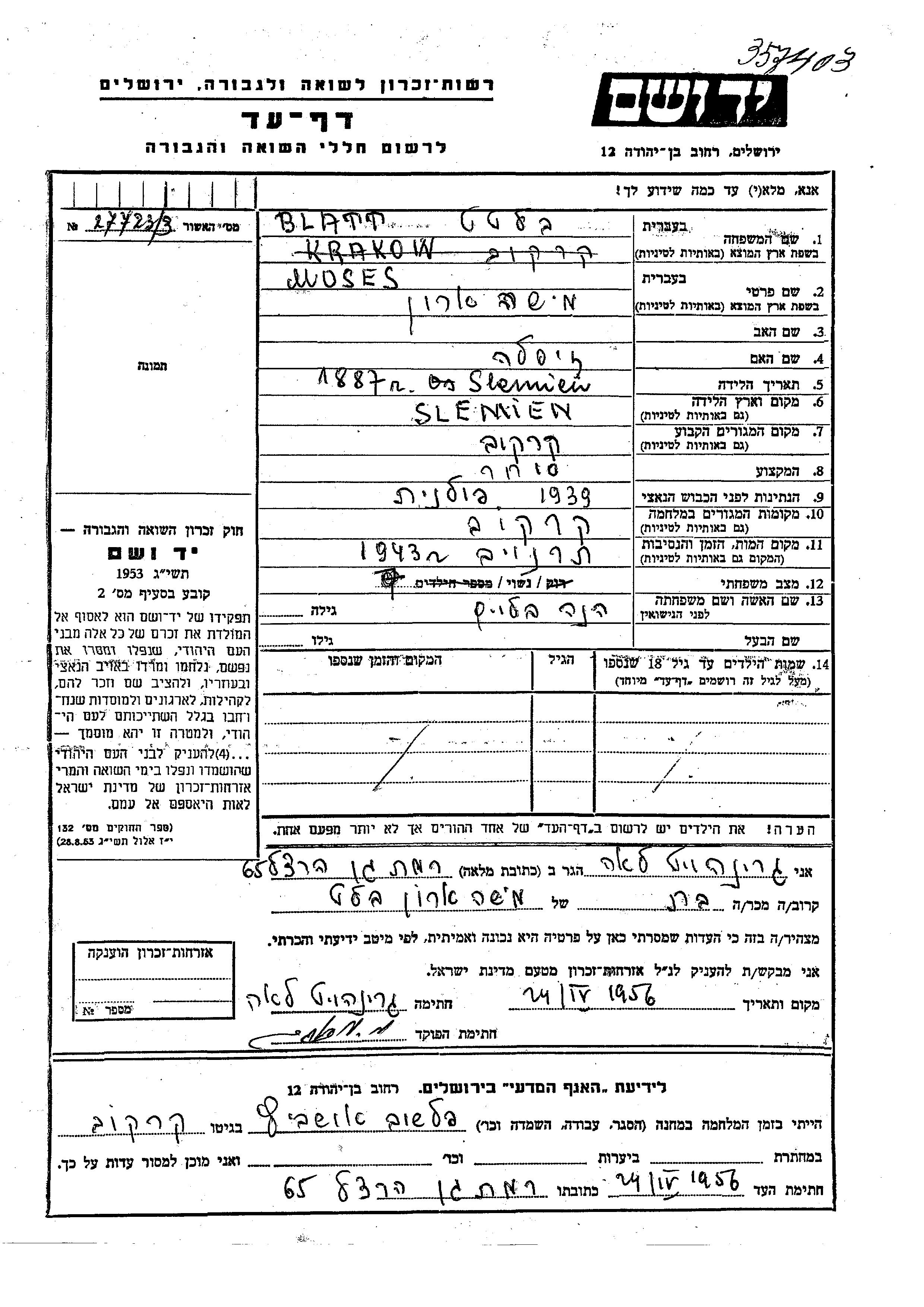 Мозес Арон Блатт, место рождения: Slemien, Польша.Mать:Зисла. Торговец / торговка. Женат / замужем. Место жительства до войны: Краков, Польша. Место во время войны: Краков, Польша.