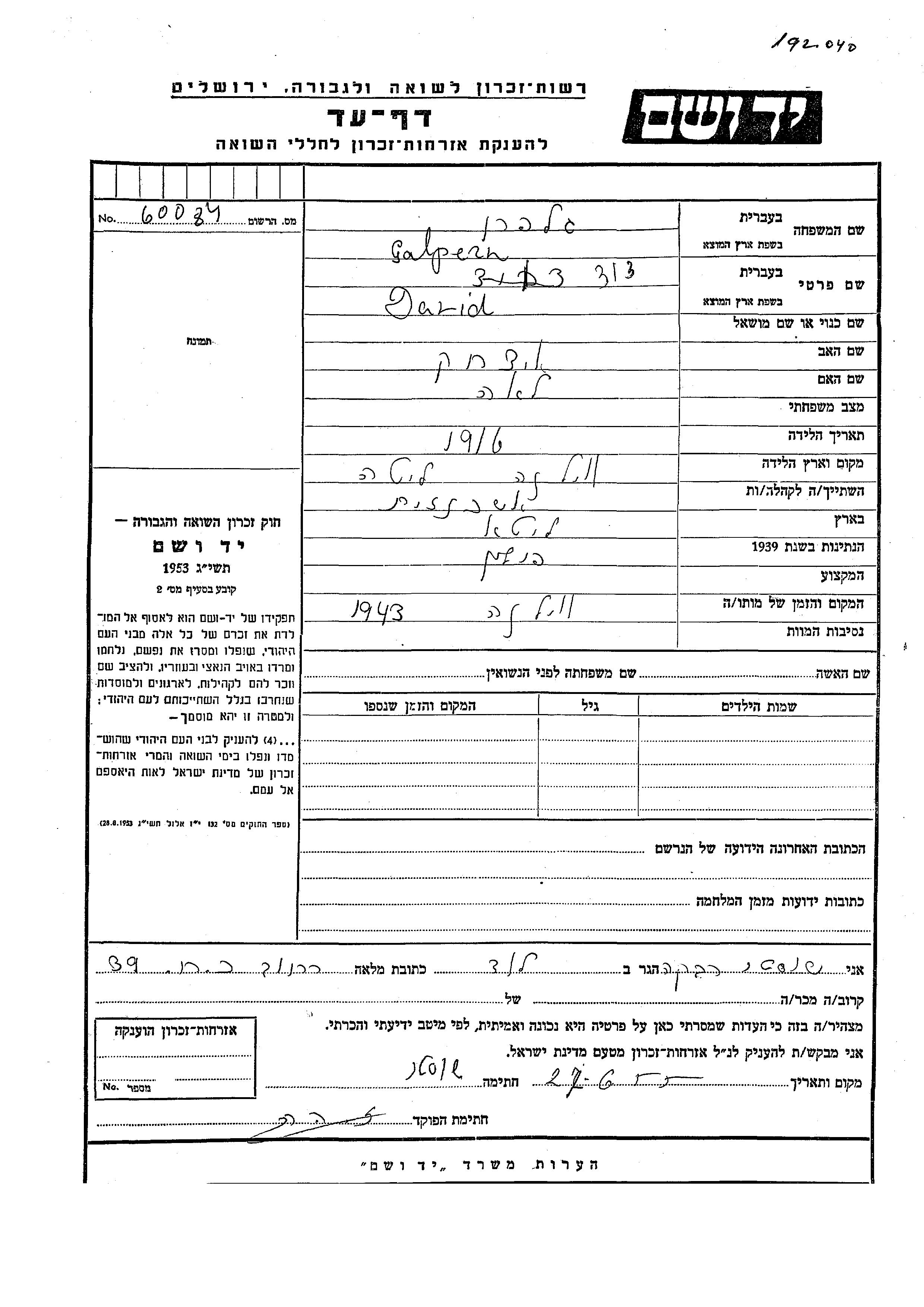 Давид Гальперн, место рождения: Вильнюс, Польша. Отец: Ицхак, mать:Лея.