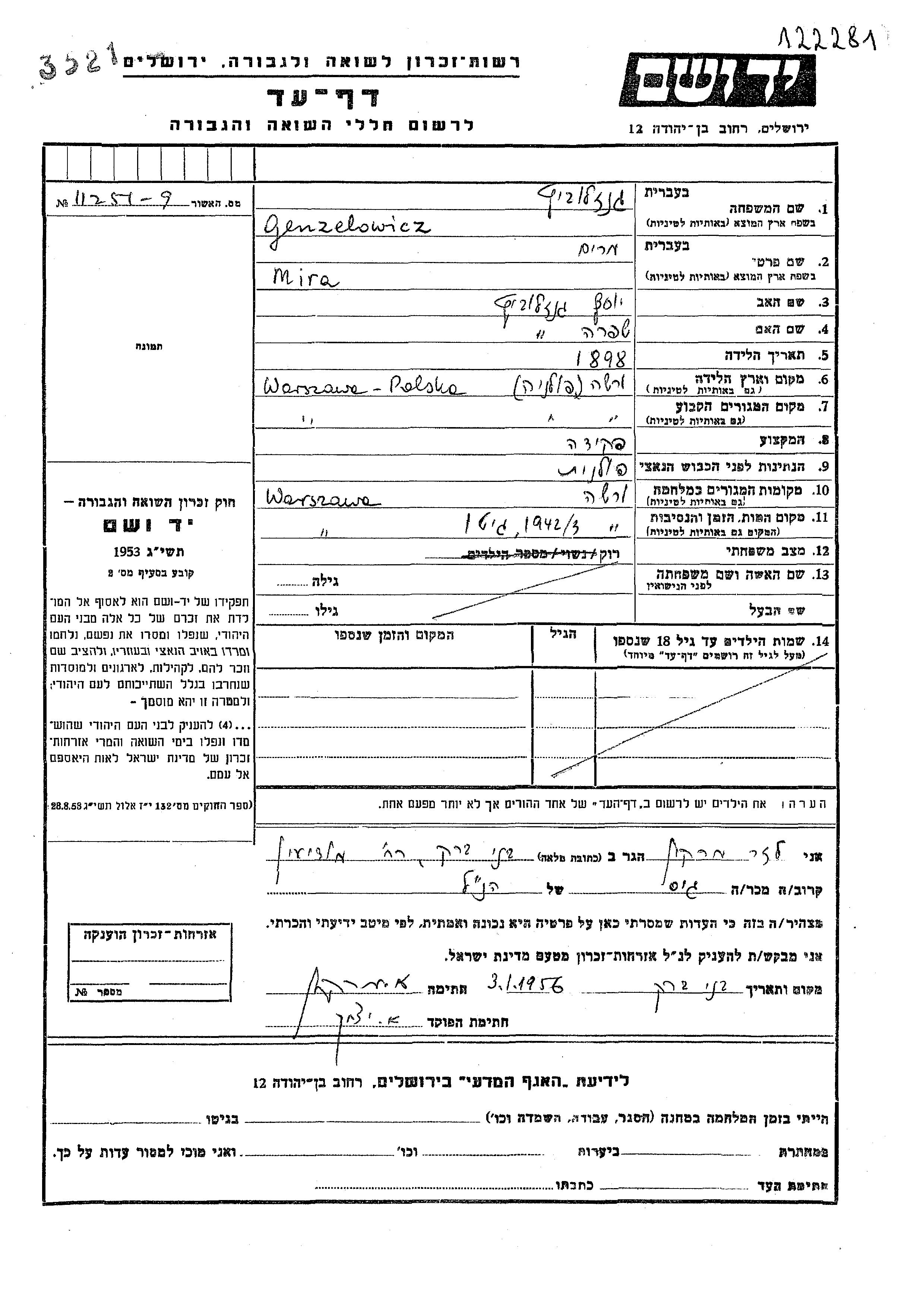 Гензелович Мира Мирьям 1898 Варшава, Польша Лист свидетельских показаний