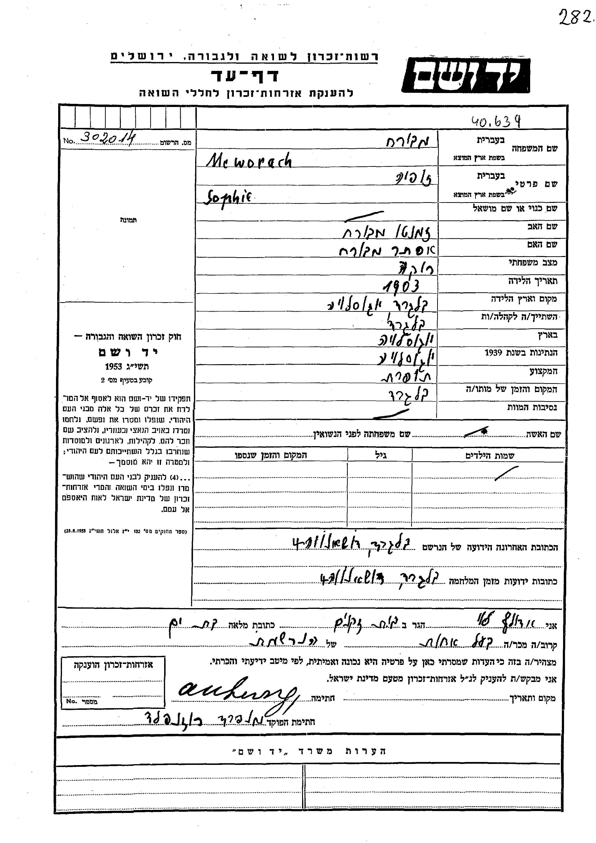 Софи Меворах, место рождения: Белград, Югославия. Отец: Земанто, mать:Эстер. Швея. Холост / не замужем. Место жительства до войны: Белград, Югославия. Место во время войны: Белград, Югославия.