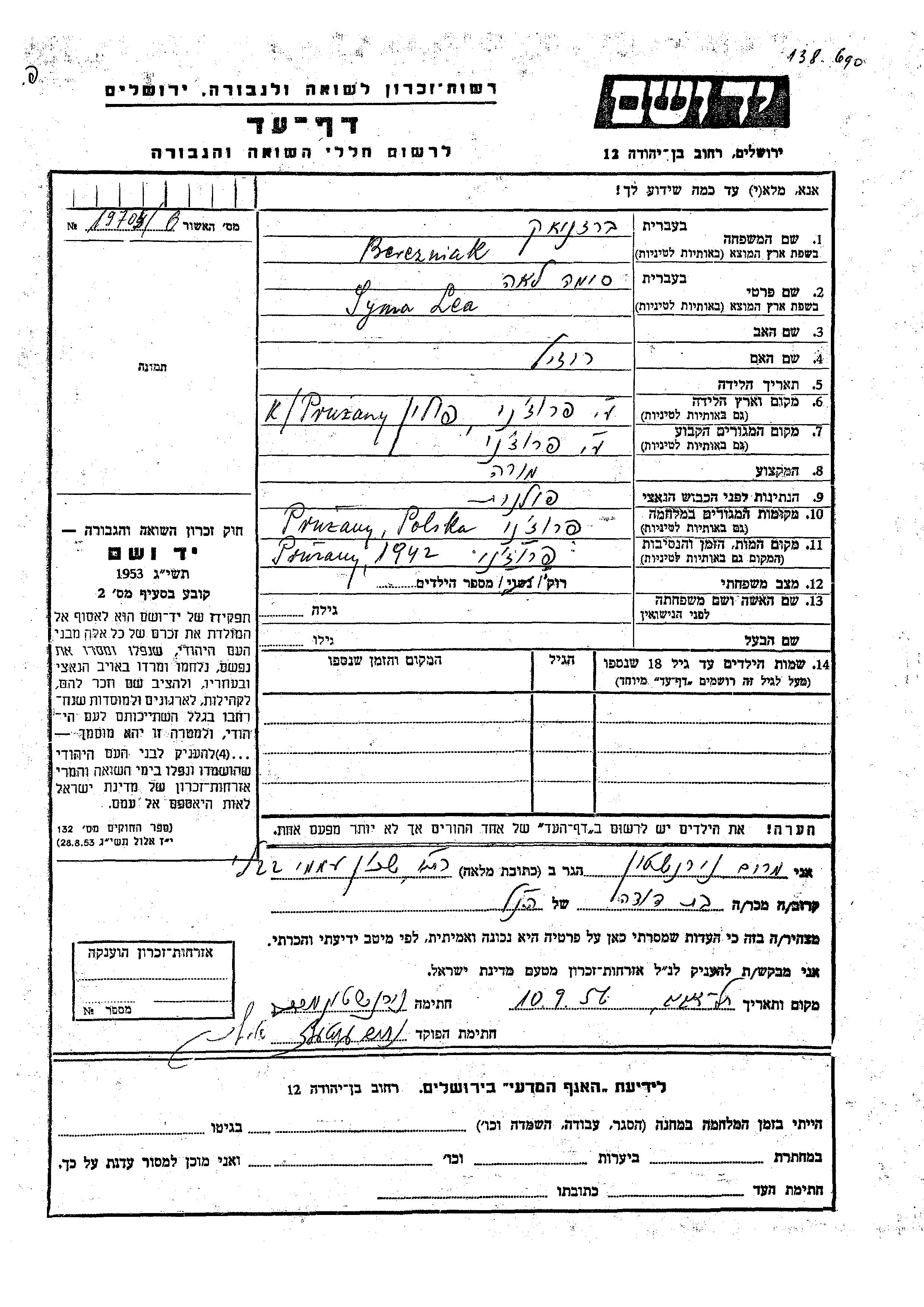 Сима Лея Березняк, место рождения: Пружаны, Польша.Mать:Рейзил. Учитель / учительница. Холост / не замужем. Место жительства до войны: Пружаны, Польша. Место во время войны: Пружаны, Польша.