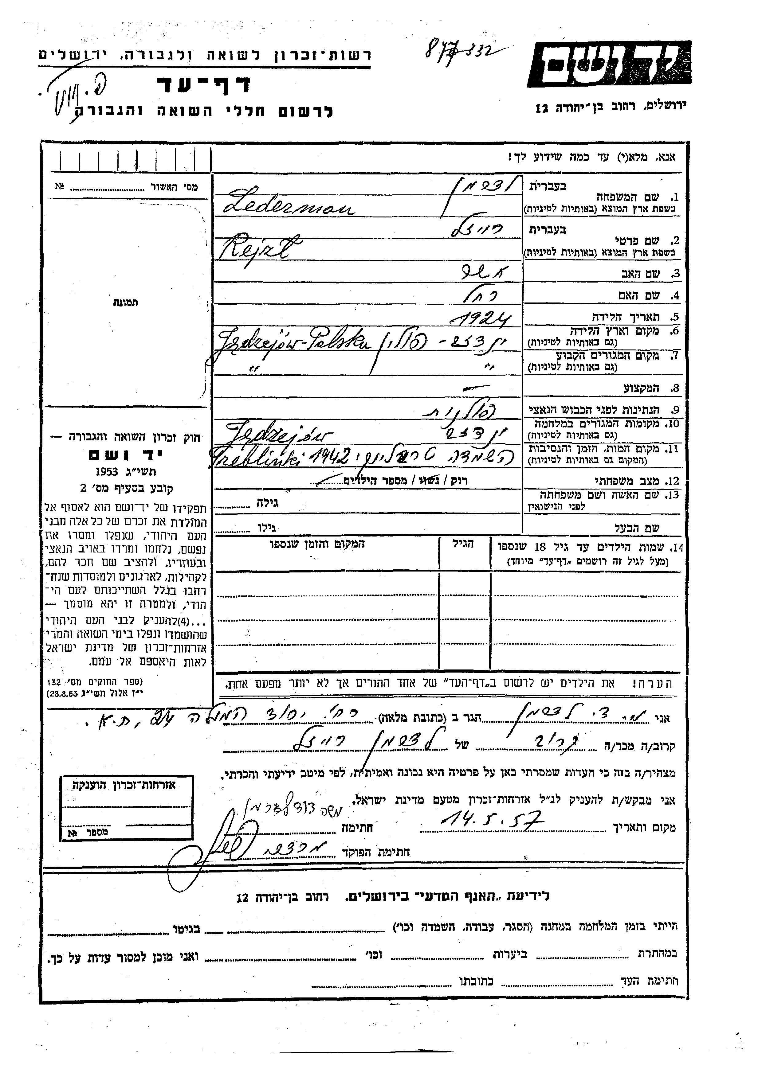 Рейзл Ледерман, место рождения: Енджеюв, Польша. Отец: Ашер, mать:Рахель. Холост / не замужем. Место жительства до войны: Енджеюв, Польша. Место во время войны: Енджеюв, Польша.
