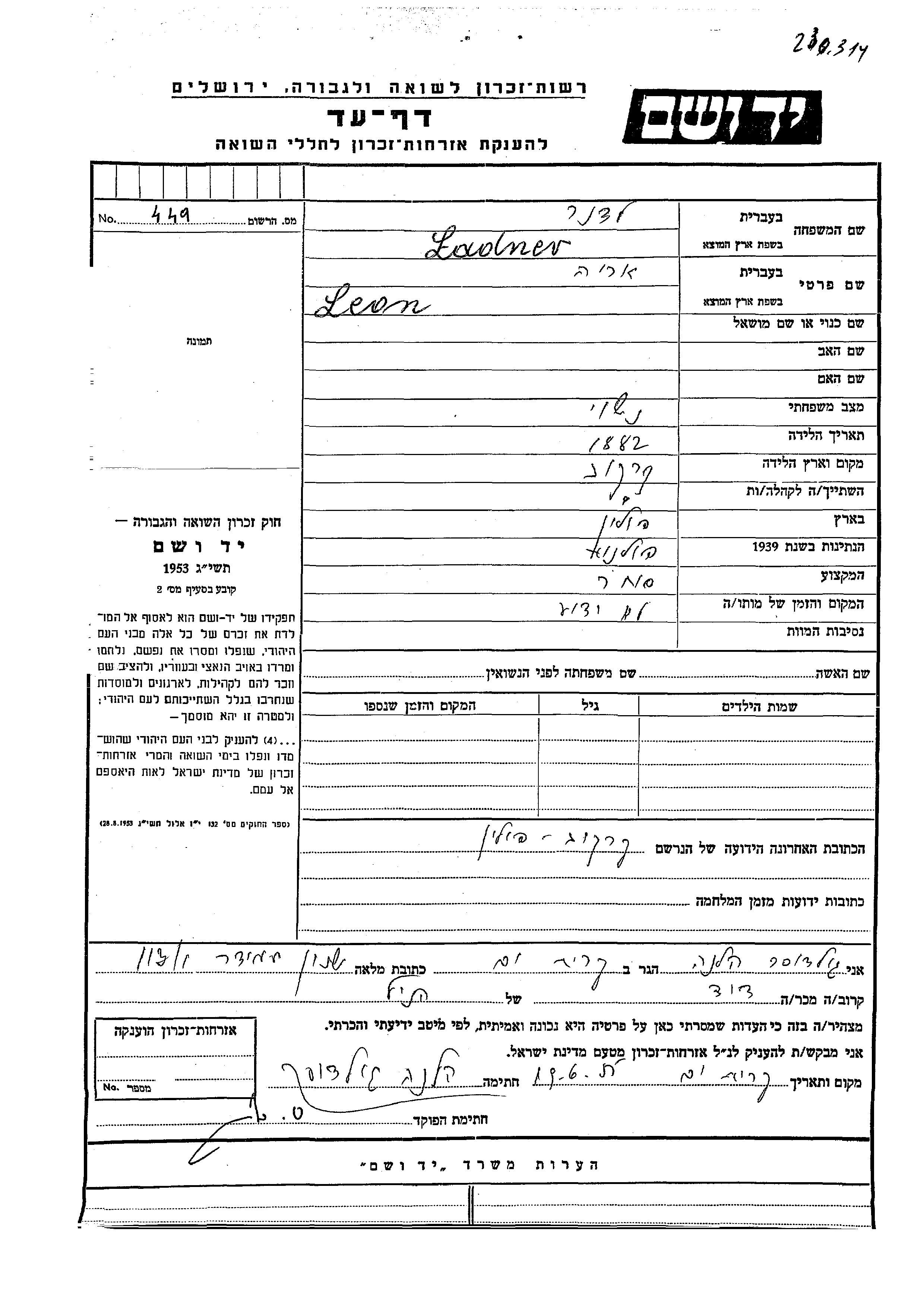 Ладнер Леон Арье 1882 Краков, Польша Лист свидетельских показаний