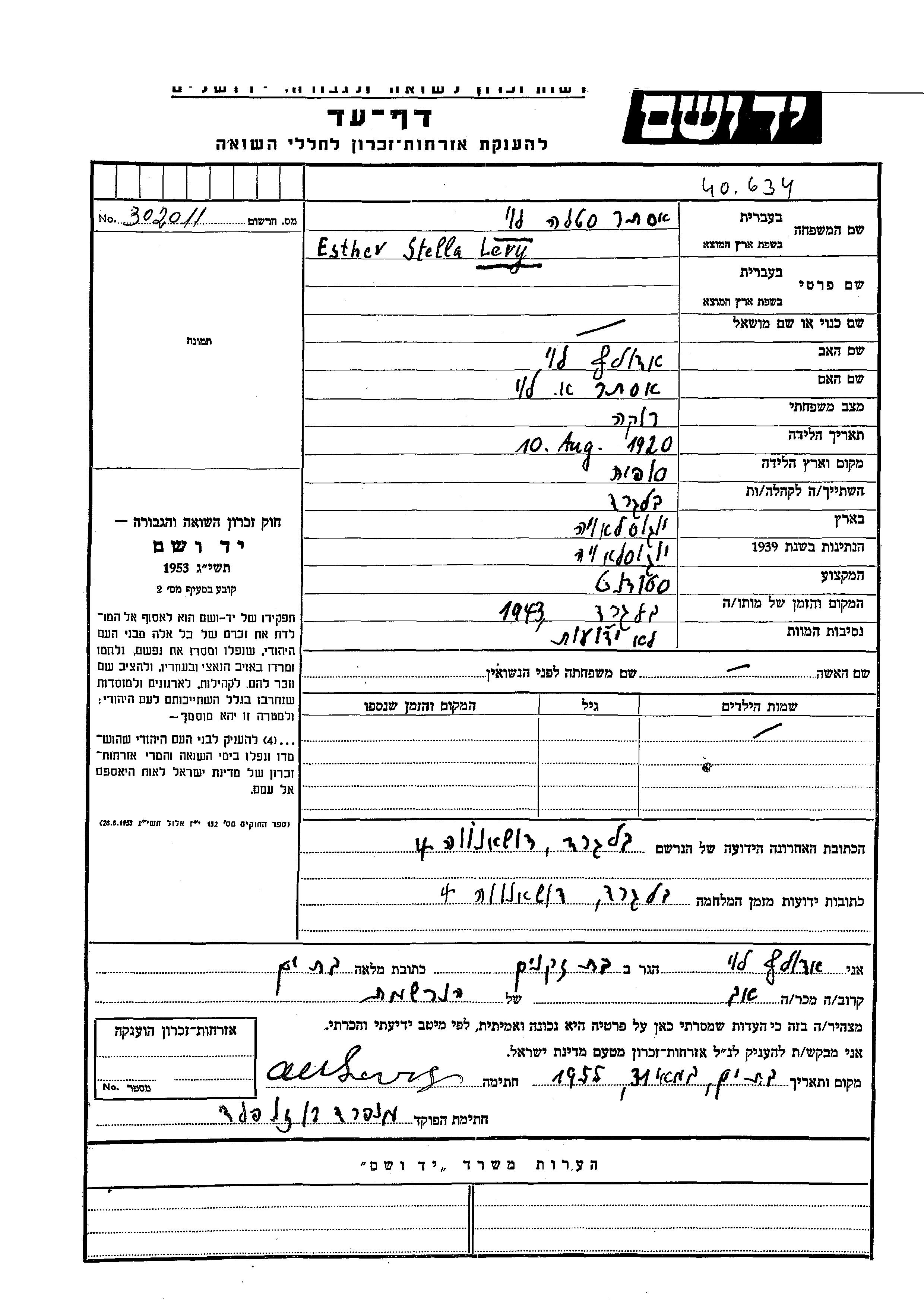 Леви Эстер Стелла 1920 Белград, Югославия Лист свидетельских показаний